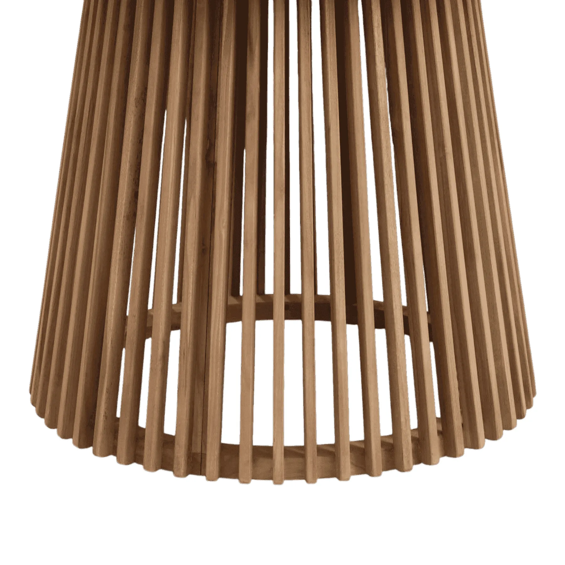 Make a modern statement with this round dining table Its slatted teak top is complemented by a striking pedestal base, composed of numerous vertical slats that create an airy, cage-like effect This piece is perfect for an outdoor patio or a contemporary dining room