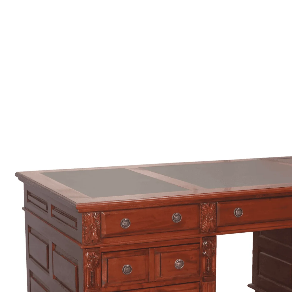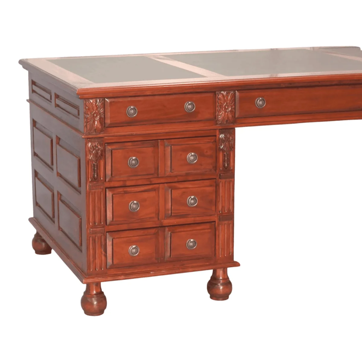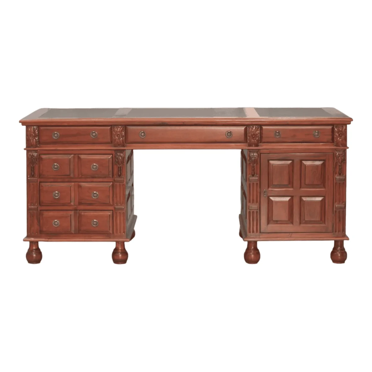 Imposing and substantial this desk is anchored by heavy bun feet and enriched with deep relief carvings on the pilasters The twin-pedestal configuration maximizes storage with a mix of drawers and cupboards all accessible via antiqued ring pulls The leather top insert provides a distinguished writing surface while the panelled sides ensure the desk looks handsome from every angle allowing it to stand freely in the center of a room commanding authority