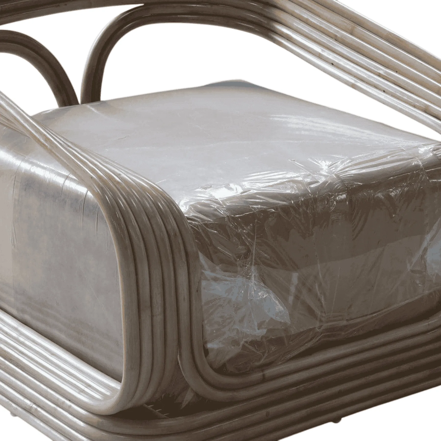 This eye-catching chair is built entirely from bent and bundled rattan, giving it a classic retro-bohemian look Its continuous, curved frame forms the arms and back, creating a cozy “barrel” silhouette This piece (shown with its cushion wrapped in plastic) is perfect for a sunroom