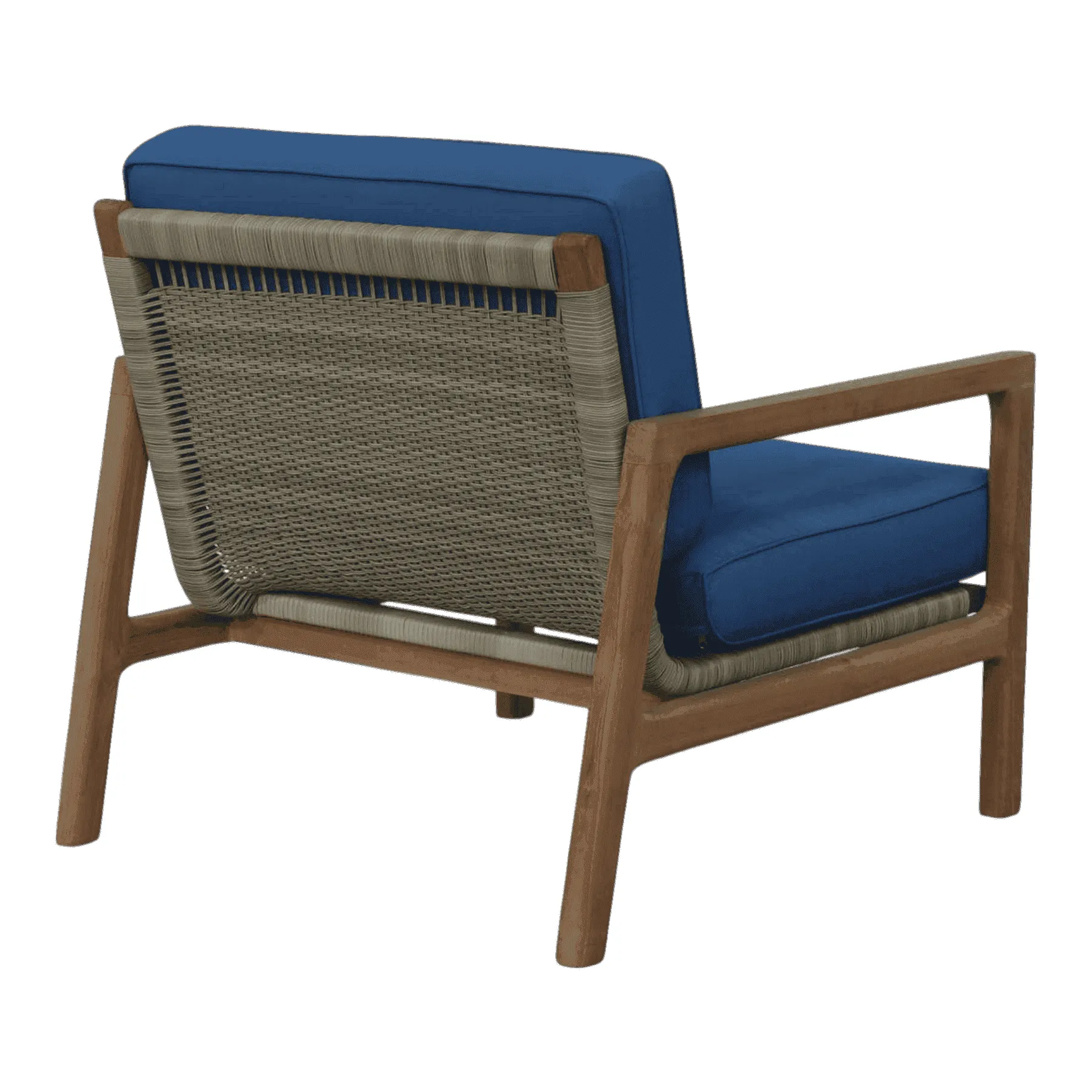 This lounge chair combines a natural teak frame with a pop of vibrant color Its simple, modern frame features a woven rope support system for the seat The piece is brought to life by thick, plush cushions upholstered in a stunning royal blue, offering both high comfort and high impact This is a perfect, resort-style chair for a patio or sunroom