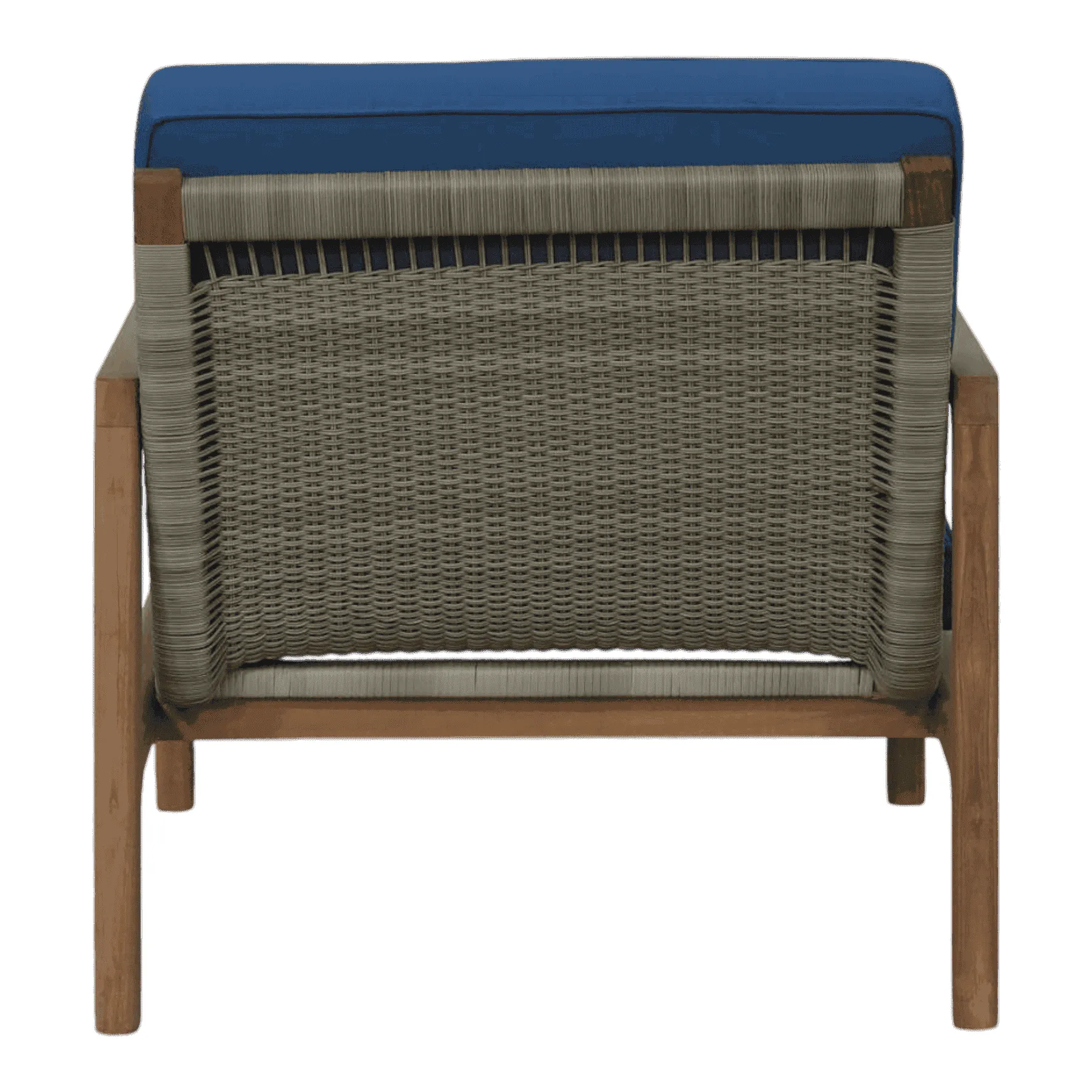 Primary Frame: Solid Teak Wood | Joinery: Mortise and Tenon | Finish: Natural Teak Oil | Upholster & Cushion: Woven Rope Seat Base, Sunproof® Fabric (Royal Blue)