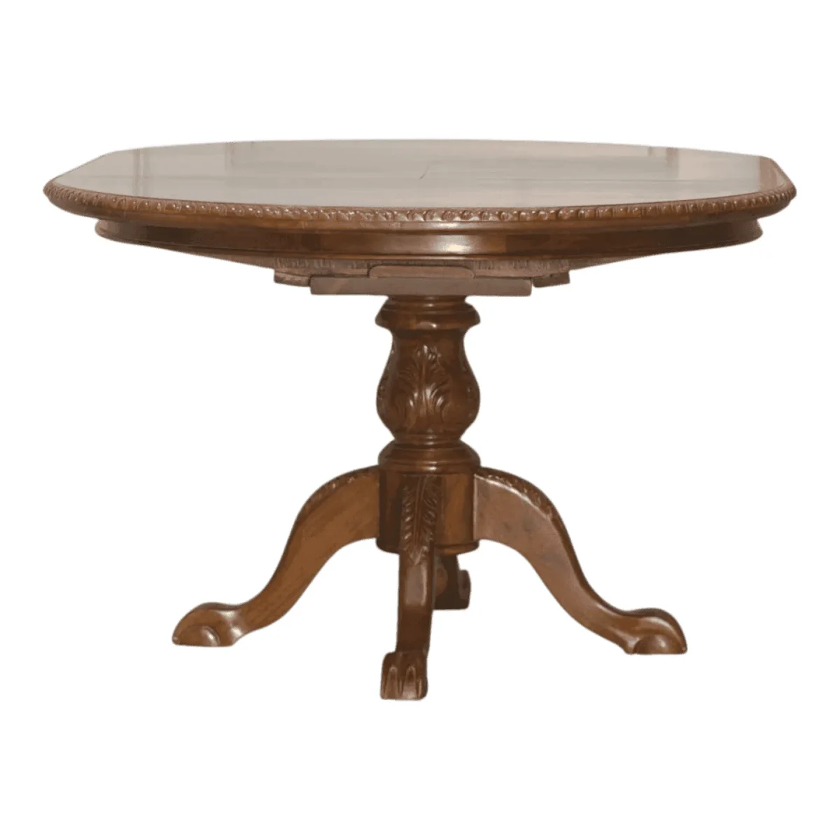 Anchor your dining space with this elegant round table that blends sturdy construction with decorative finesse The tabletop features a finely carved gadroon edge that catches the light and adds texture to the perimeter Beneath a turned urn-style pedestal provides solid support flowing into three gracefully curved legs that terminate in carved feet The rich polished finish highlights the natural beauty of the wood grain making it a warm and inviting centerpiece for family meals