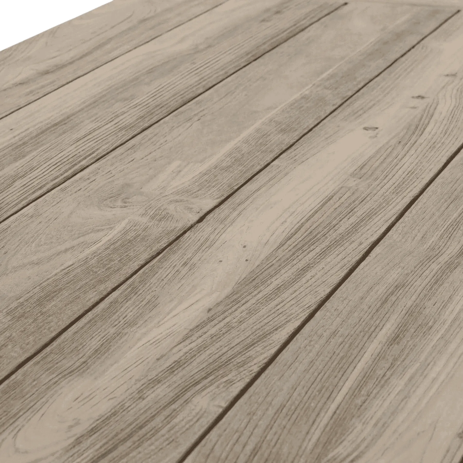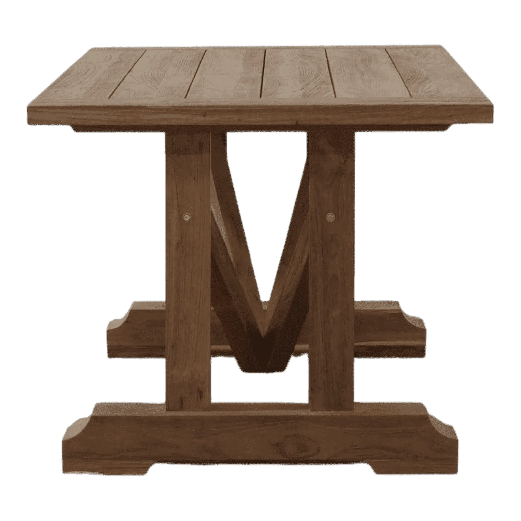 Primary Frame: Solid Wood (likely Teak or Reclaimed Pine) | Joinery: Trestle Construction, Mortise and Tenon | Finish: Natural or Lightly Stained Finish