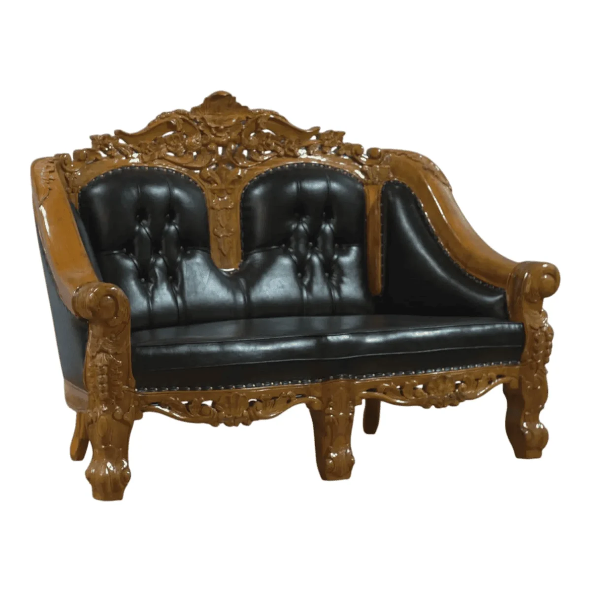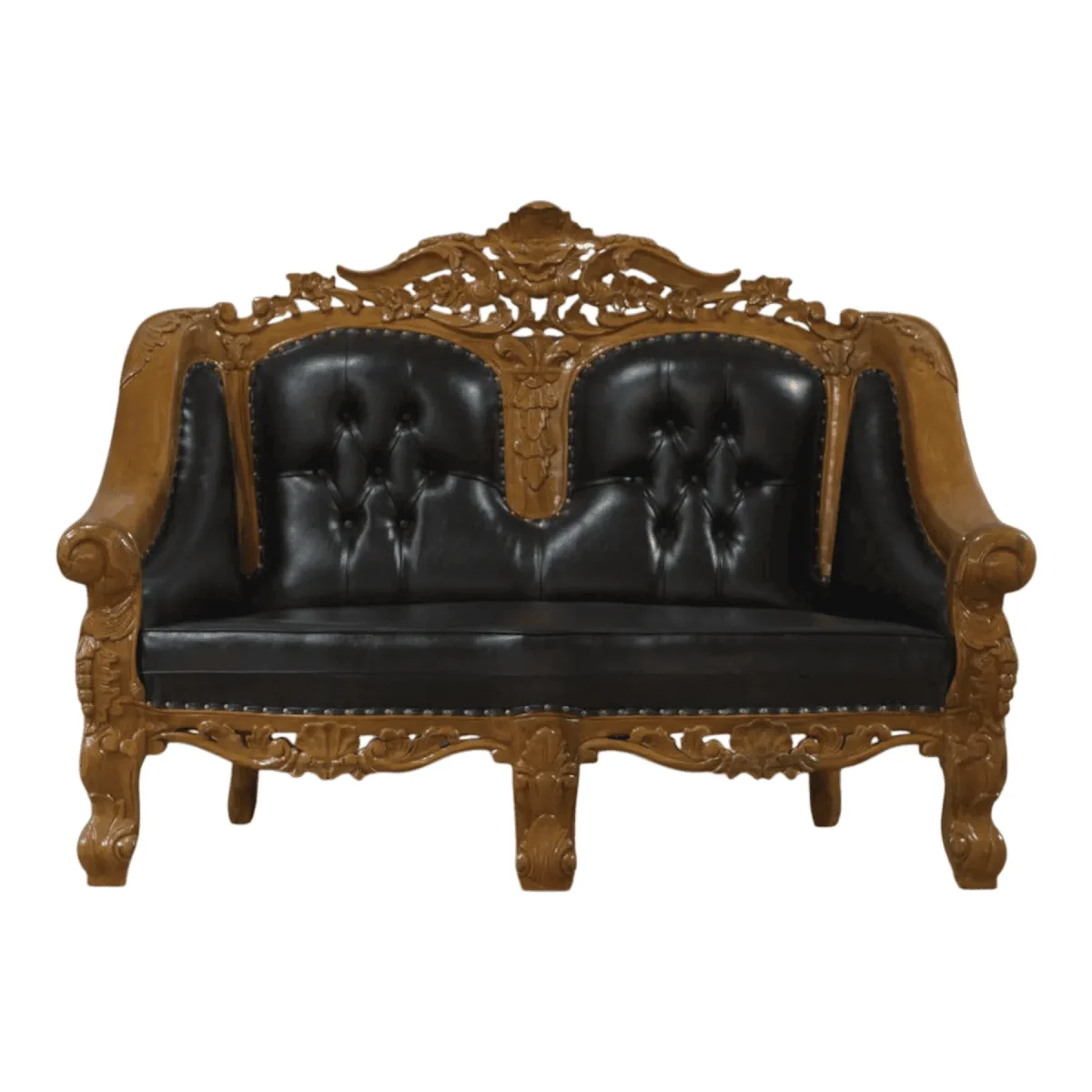 Experience the perfect marriage of rugged durability and refined elegance with this triple-seated sofa that features supple black leather set against a richly carved wooden frame The deep button tufting on the backrest provides a sophisticated aesthetic while ensuring maximum comfort for you and your guests during long evenings of conversation This sofa is designed for the modern manor house where comfort is paramount but style is never sacrificed for function The warm honey tones of the wood frame provide a beautiful contrast to the dark leather creating a look that is both grounded and luxurious Each carving is polished to a soft sheen highlighting the natural beauty of the grain and the skill of the artisan who shaped it This is a piece that ages beautifully with the leather developing a unique patina over time making it a truly personal part of your home