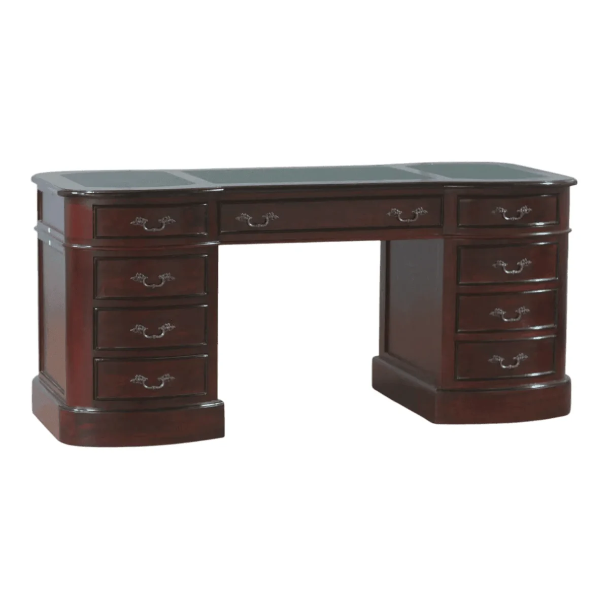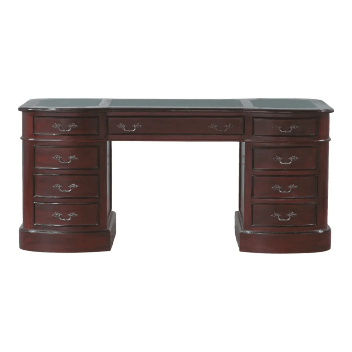 Elevate your professional environment with a desk that speaks of sophistication and fluid design lines featuring a unique curved front that invites collaboration and approachability Crafted from the finest dark-toned hardwoods this pedestal desk offers a commanding presence without the harshness of sharp angles providing a seamless workflow across its expansive leather-topped surface The integrated drawers are arranged symmetrically to provide ample storage while maintaining a balanced aesthetic that anchors any room with quiet confidence Whether placed in a central study or a private office its rich finish and subtle grain patterns reflect a commitment to quality and timeless style This piece serves as more than just a workstation it acts as a centerpiece for intellectual pursuits and high-level strategy sessions ensuring that every task performed feels significant and supported by world-class craftsmanship designed for the modern leader