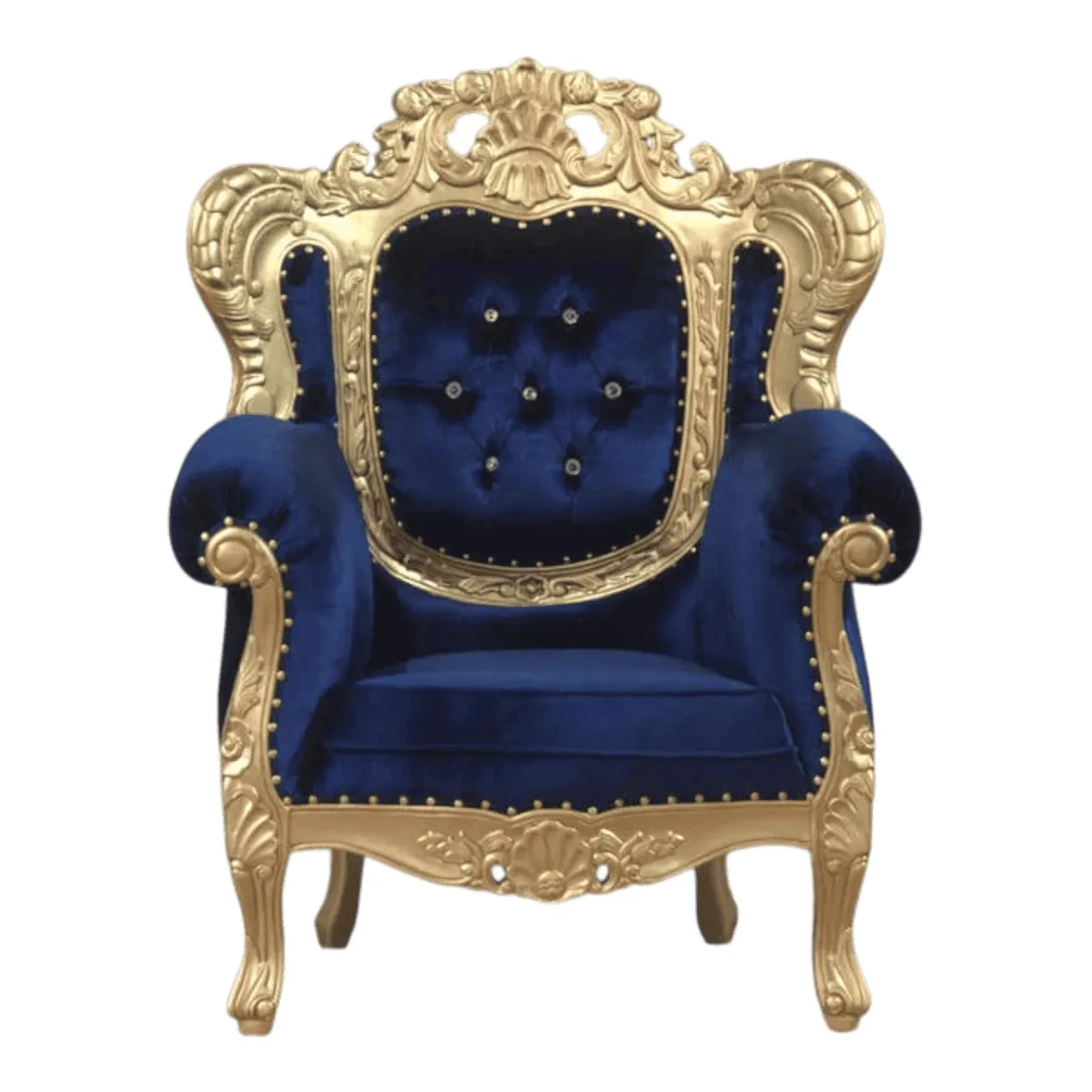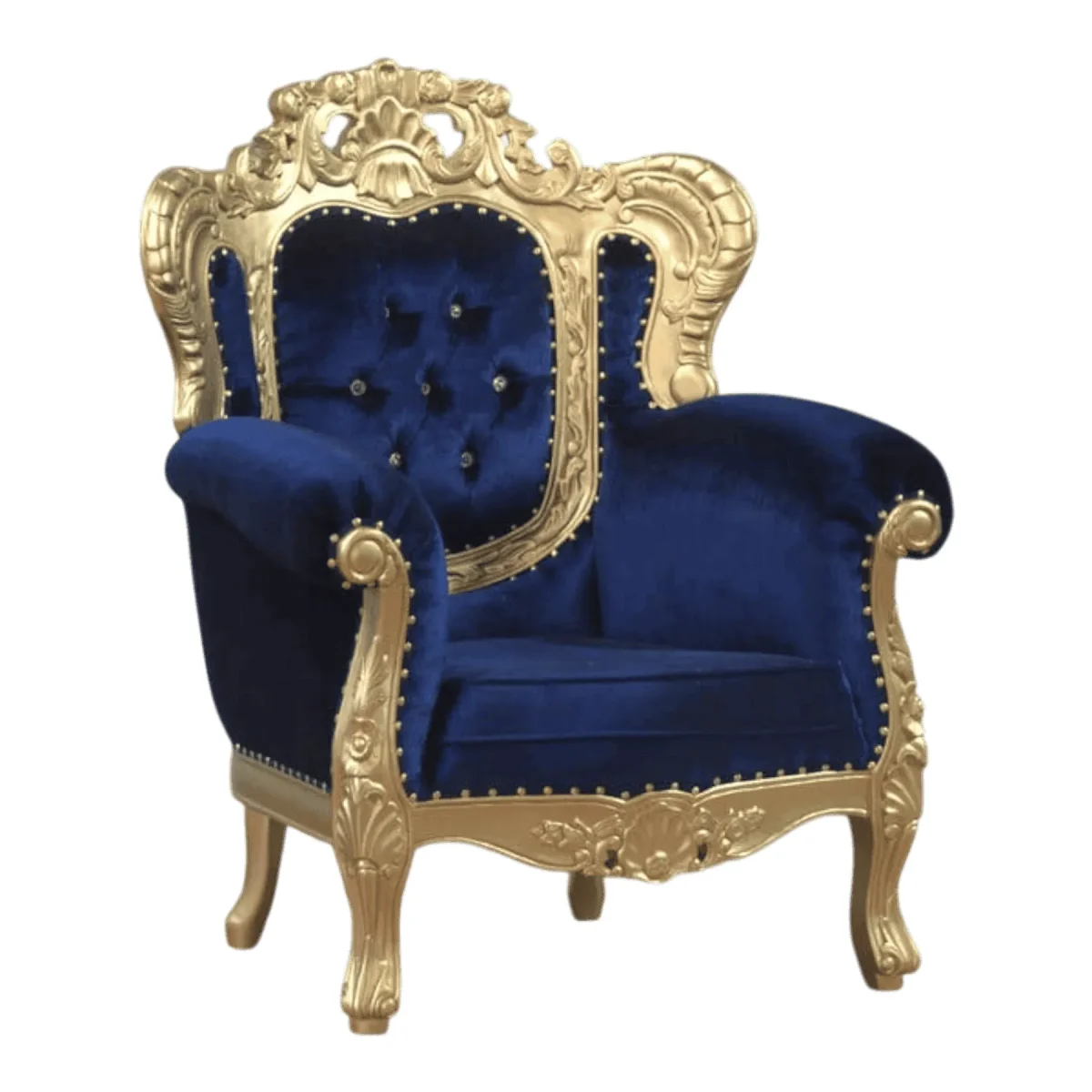 Experience the ultimate in dramatic luxury with a chair that refuses to be ignored featuring a stunning contrast between vibrant sapphire velvet and a radiant gold-leaf frame that captures the light from every angle this armchair is the personification of theatrical elegance designed for the homeowner who views their interior as a stage for high-style living the deep blue upholstery is accented with sparkling crystal-style tufting that adds a layer of glamour and sophistication while the exaggerated curves of the hand-carved frame provide a sense of movement and energy whether placed in a formal parlor or as a standalone feature piece in a master suite this chair creates an atmosphere of decadence and joy inviting you to sit back and feel like the protagonist of your own grand story surrounded by the finest materials and most daring design choices