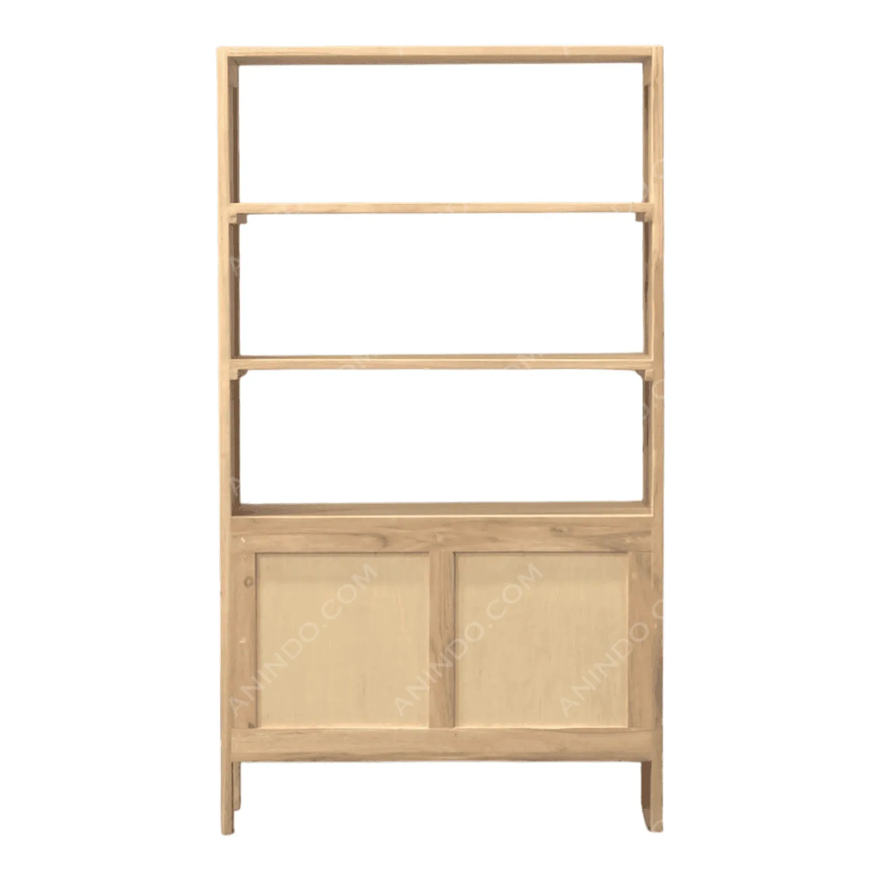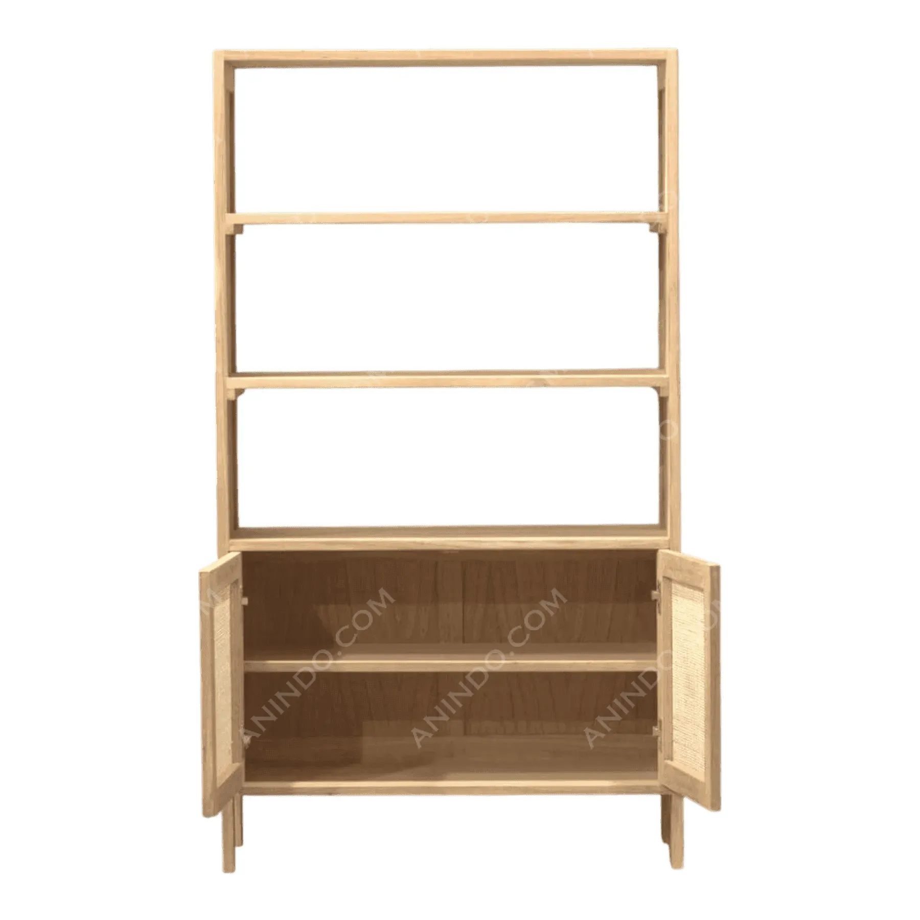 Combine open storage with concealed organization in this beautifully crafted shelving unit The upper section features three robust open shelves perfect for displaying books plants or curated decor while the lower cabinet offers discreet storage behind woven rattan doors The natural Teak wood finish enhances the organic texture of the cane webbing creating a piece that feels airy and grounded Ideal for living rooms or home offices seeking a touch of bohemian minimalism