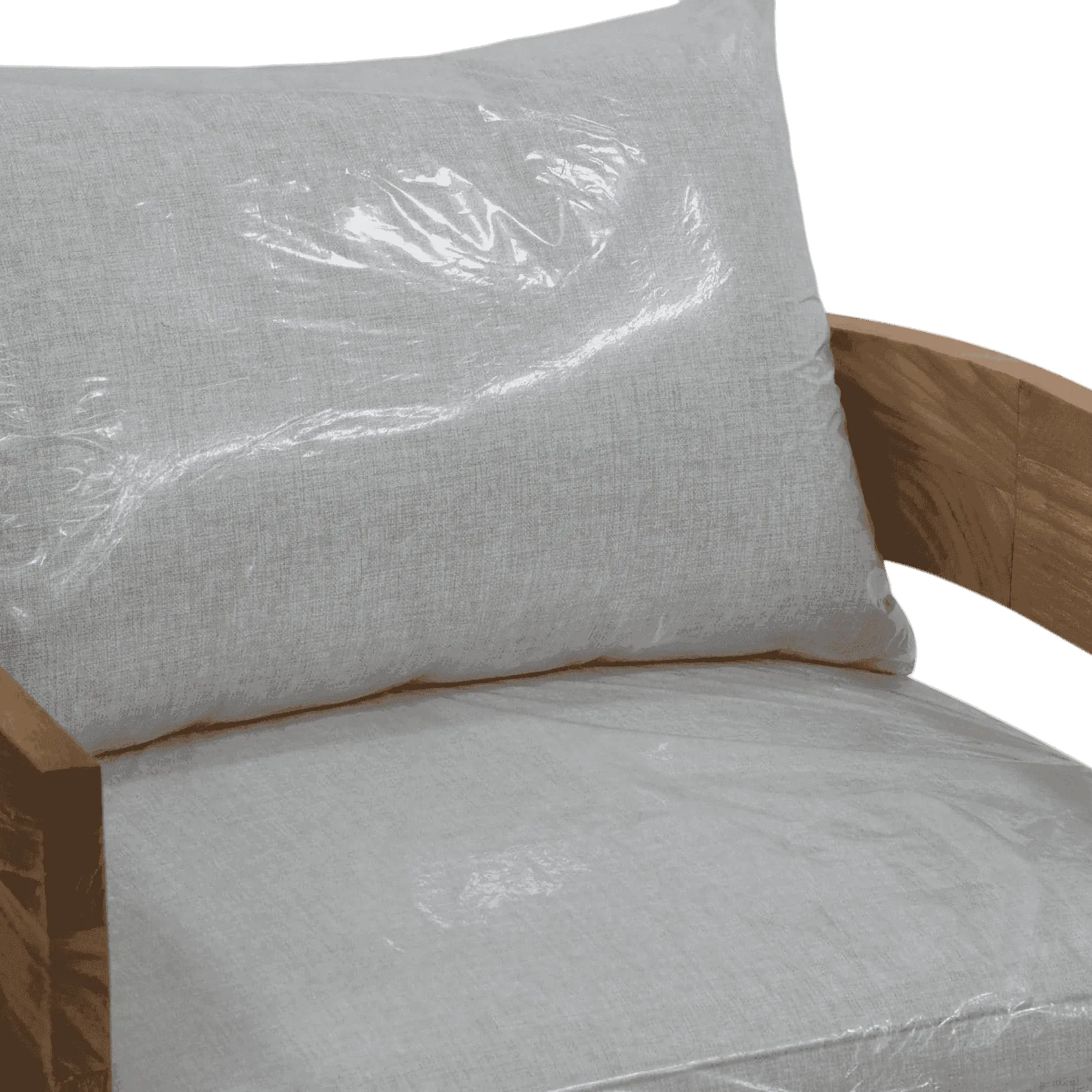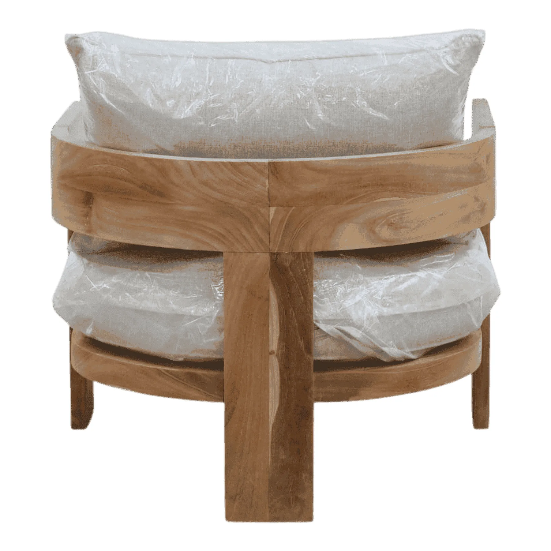 Primary Frame: Grade A Teak | Joinery: Mortise and Tenon, Curved Armrests | Finish: Natural Oil Finish | Upholster & Cushion: Sunproof® Fabric (Off-White/Beige)