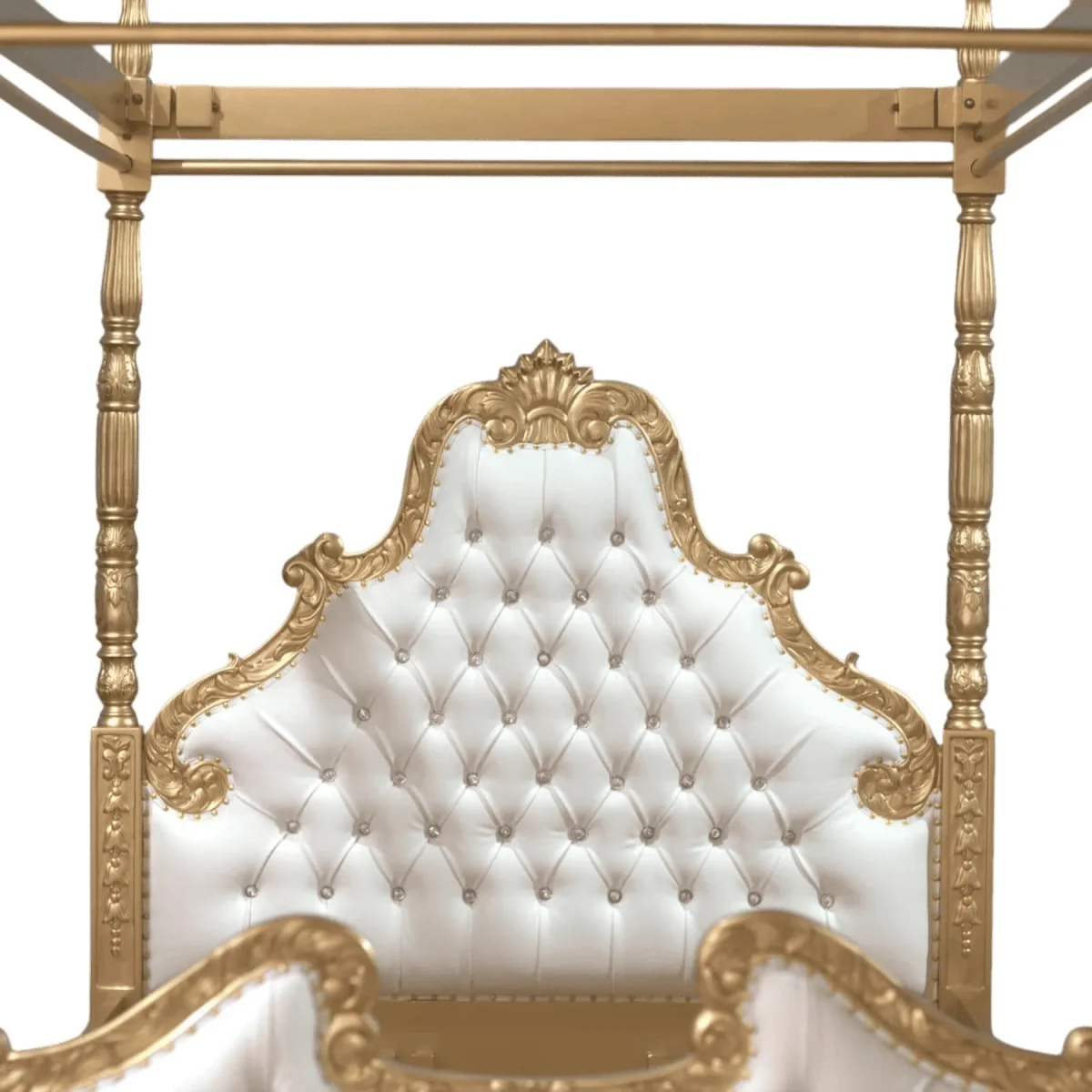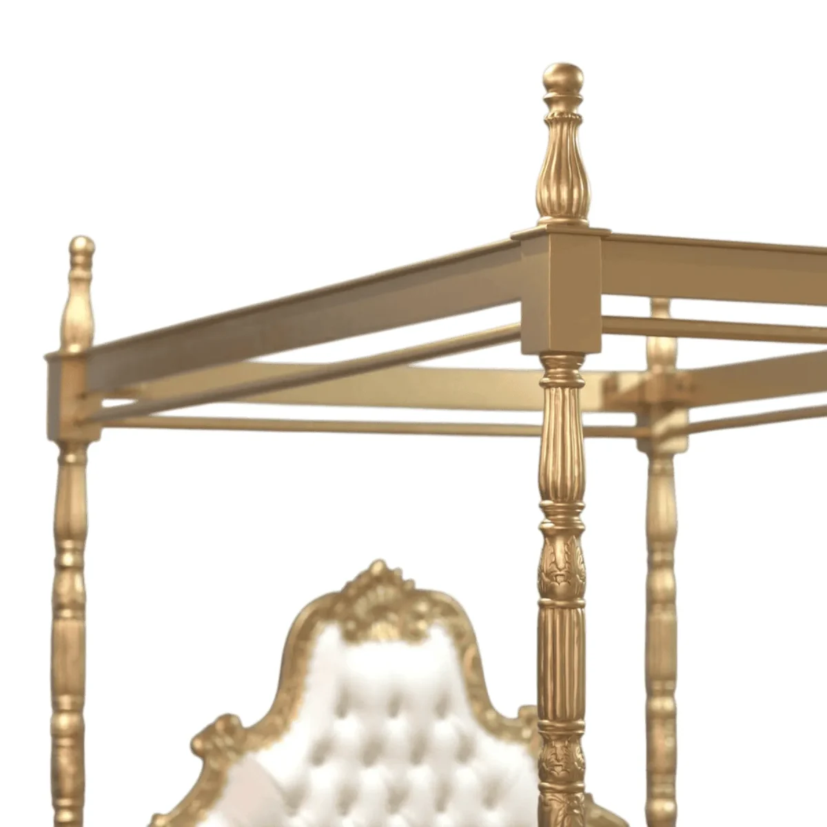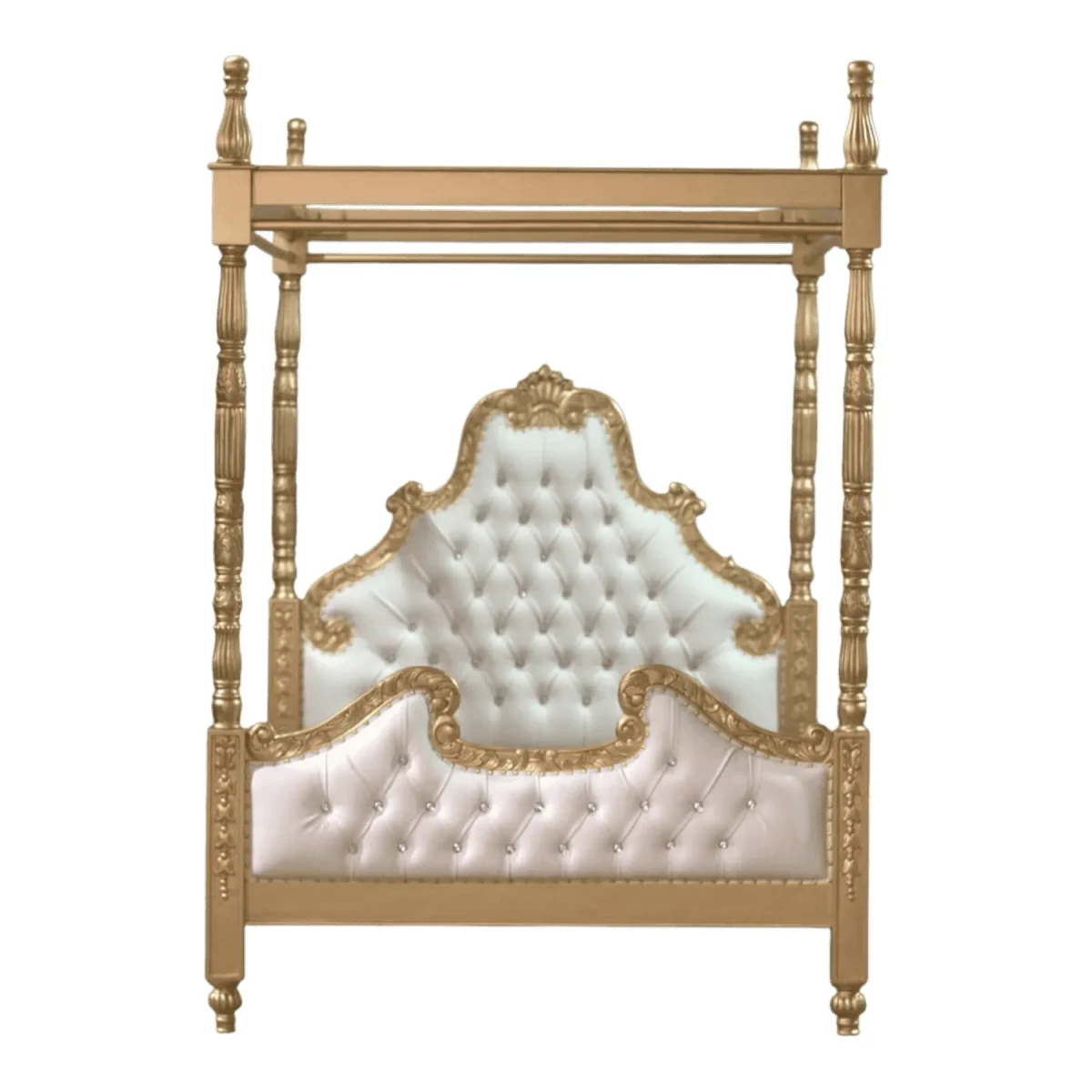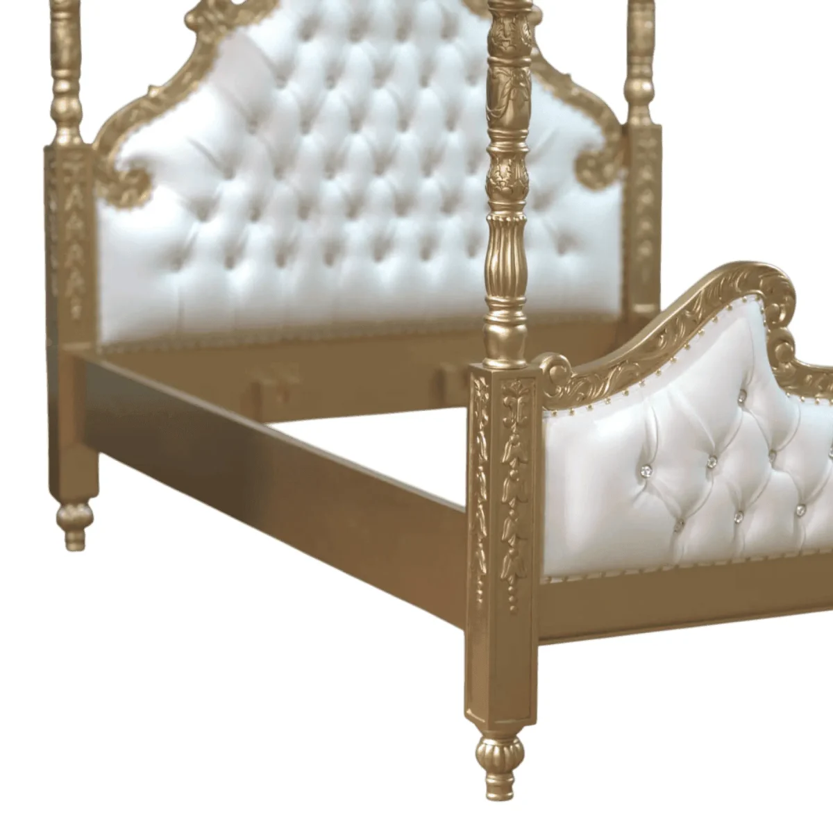 Awaken in a realm of golden splendor with a canopy bed that redefines the meaning of a luxurious retreat This breathtaking piece features a shimmering gilded frame that supports a high-arching headboard upholstered in plush button-tufted cream leather The metallic finish catches the morning light creating a radiant energy that fills the room with warmth and opulence Designed for those who appreciate the theatrical side of interior design the tall fluted posts and decorative finials provide a sense of verticality and grandeur that makes any bedroom feel like a royal chamber The combination of soft textures and hard metallic surfaces offers a sensory balance that is both inviting and impressive Every inch is handcrafted by artisans dedicated to preserving traditional gilding techniques ensuring a finish that remains brilliant for generations as a testament to your exquisite taste in fine living