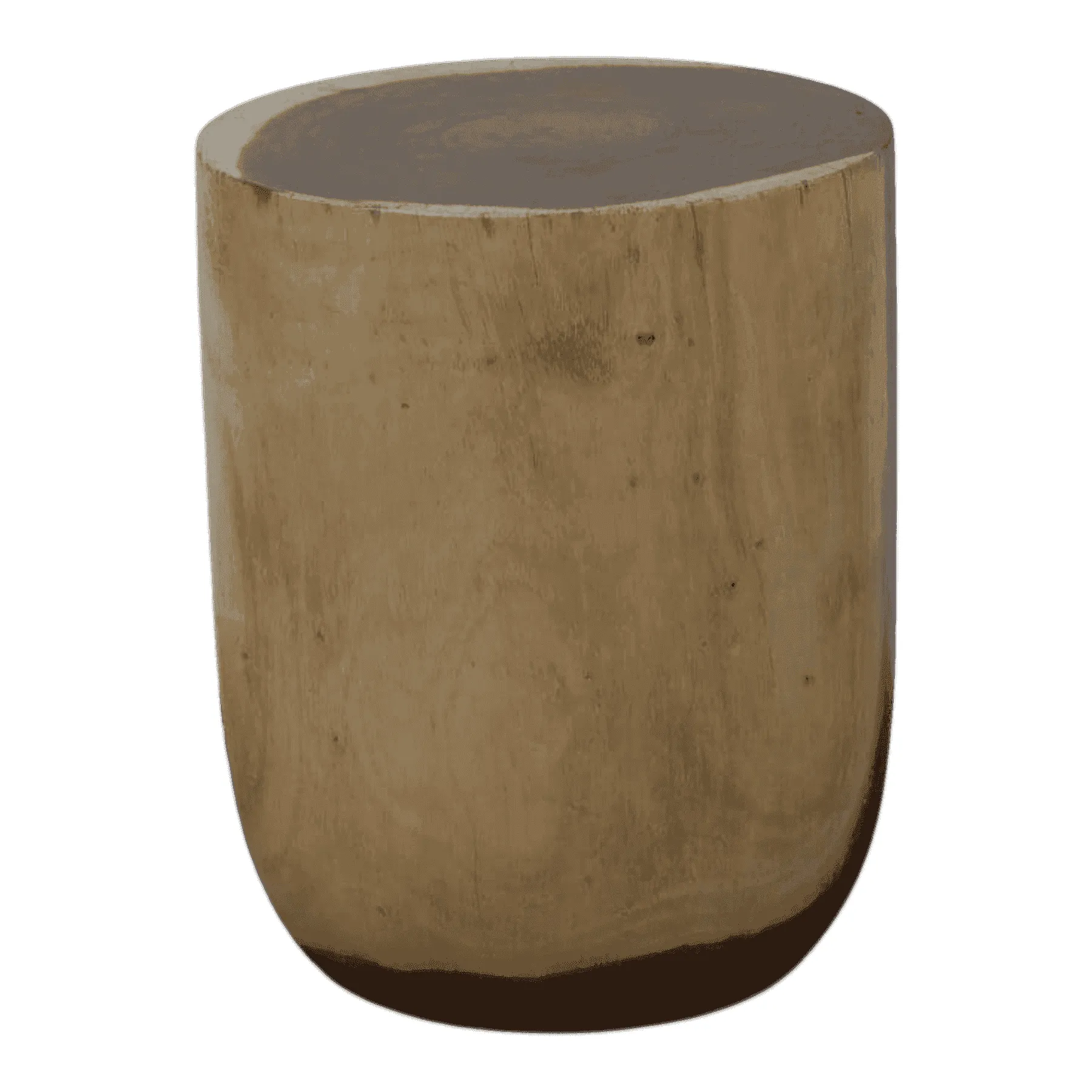 This drum stool is a beautiful example of organic minimalism Carved from a single piece of solid wood, it showcases a rich, flowing grain that wraps around its simple cylindrical form The gently curved base adds a subtle softness to its profile This versatile piece works perfectly as a small side table, a plant stand, or a rustic accent seat