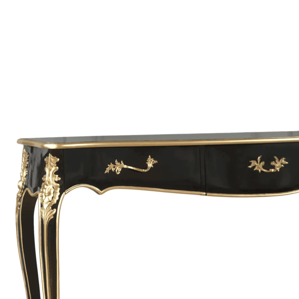Elevate your entryway or hallway with this stunning console table that serves as a perfect example of refined elegance and classical proportions The table features a sleek black lacquer finish that is beautifully accented by delicate gold leaf scrolls and floral carvings along the apron and legs The long slender cabriole legs give the piece a light and airy feel while the sturdy mahogany construction ensures it can support decorative items such as vases lamps or art pieces Three discreet drawers are built into the frame providing a convenient place for keys and mail without disrupting the smooth lines of the design This table is a masterpiece of balance and symmetry designed to bring a touch of Parisian apartment style to any modern home where it will surely become a conversation starter for guests