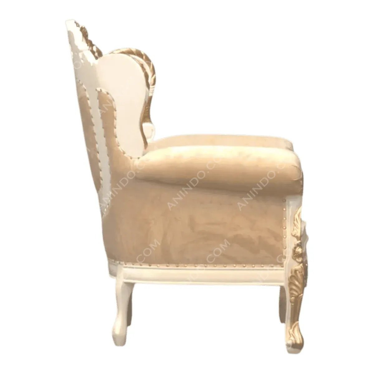 Command the room with this regal armchair that exudes the opulence of a royal court The frame is heavily carved with acanthus leaves and scrollwork finished in a brilliant gold leaf that contrasts stunningly against the creamy white base Upholstered in a plush beige velvet with button tufting on the backrest this chair offers a throne-like seating experience perfect for weddings high-end events or a luxurious formal living room