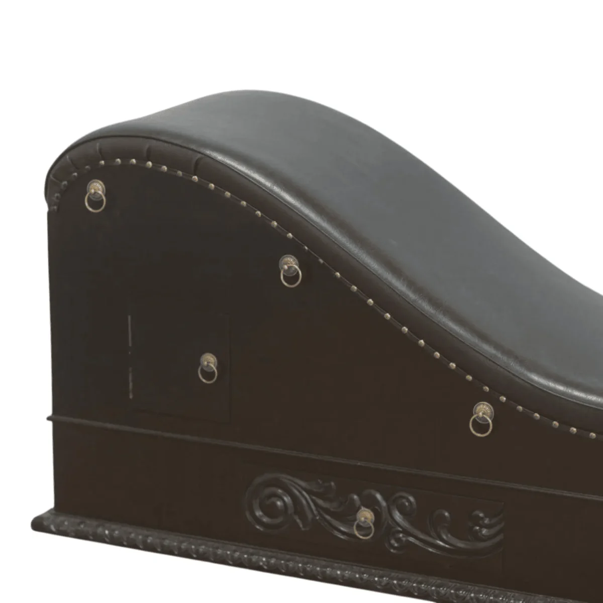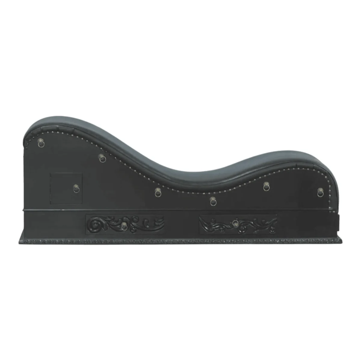Immerse yourself in an atmosphere of ultimate relaxation and sophisticated allure with this masterfully contoured chaise designed to follow the natural silhouette of the body This piece serves as a functional work of art featuring deep ebony upholstery accented by meticulous silver studding that traces its sweeping curves The base is adorned with intricate hand-carved floral motifs and traditional ring pulls offering a glimpse into a world of classical opulence and artisanal dedication Perfect for a private suite or a curated lounge this chaise provides a transformative experience that balances physical support with aesthetic grandeur Its presence elevates a room from a mere living space into a sanctuary of luxury and timeless style
