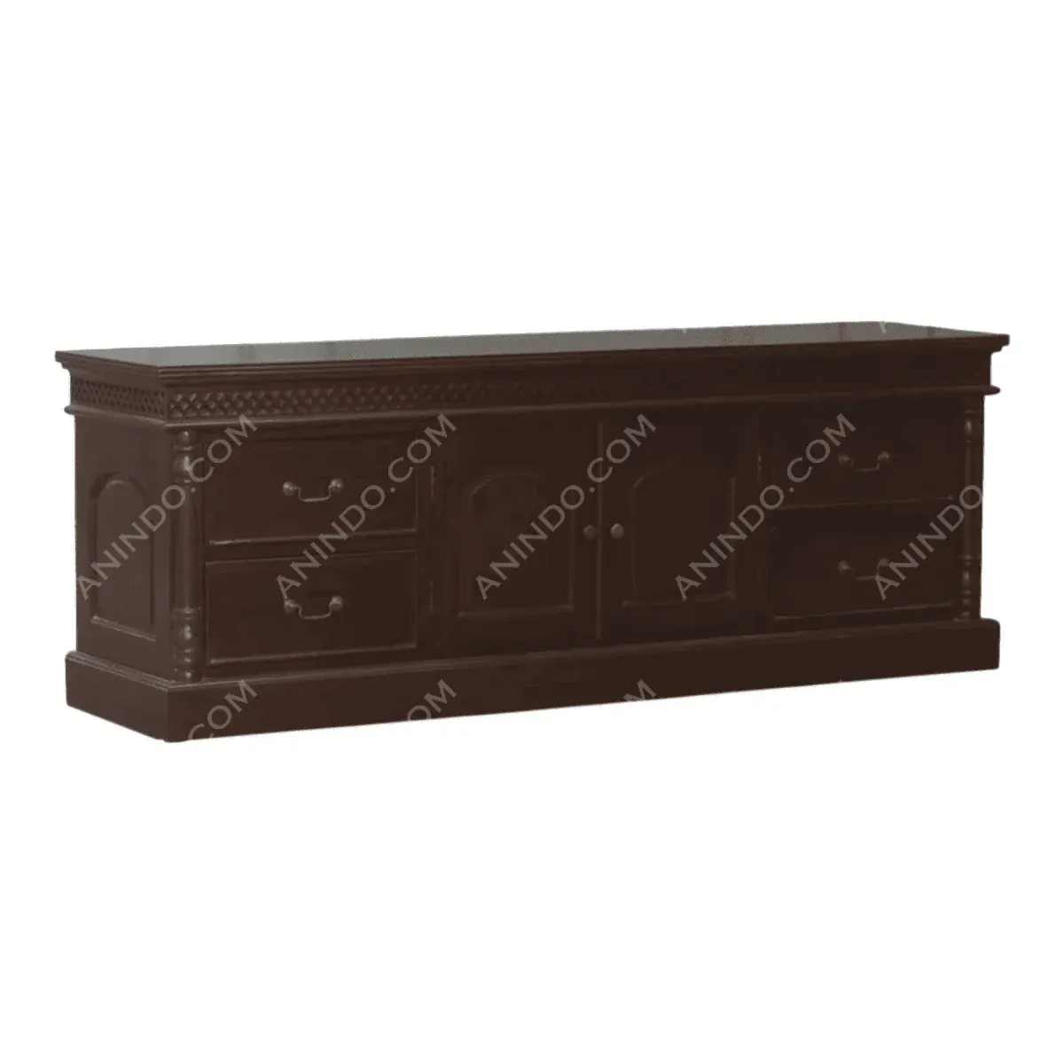 The design merges colonial sturdiness with decorative elements like the carved frieze and arched door panels striking a balance between utility and ornamentation