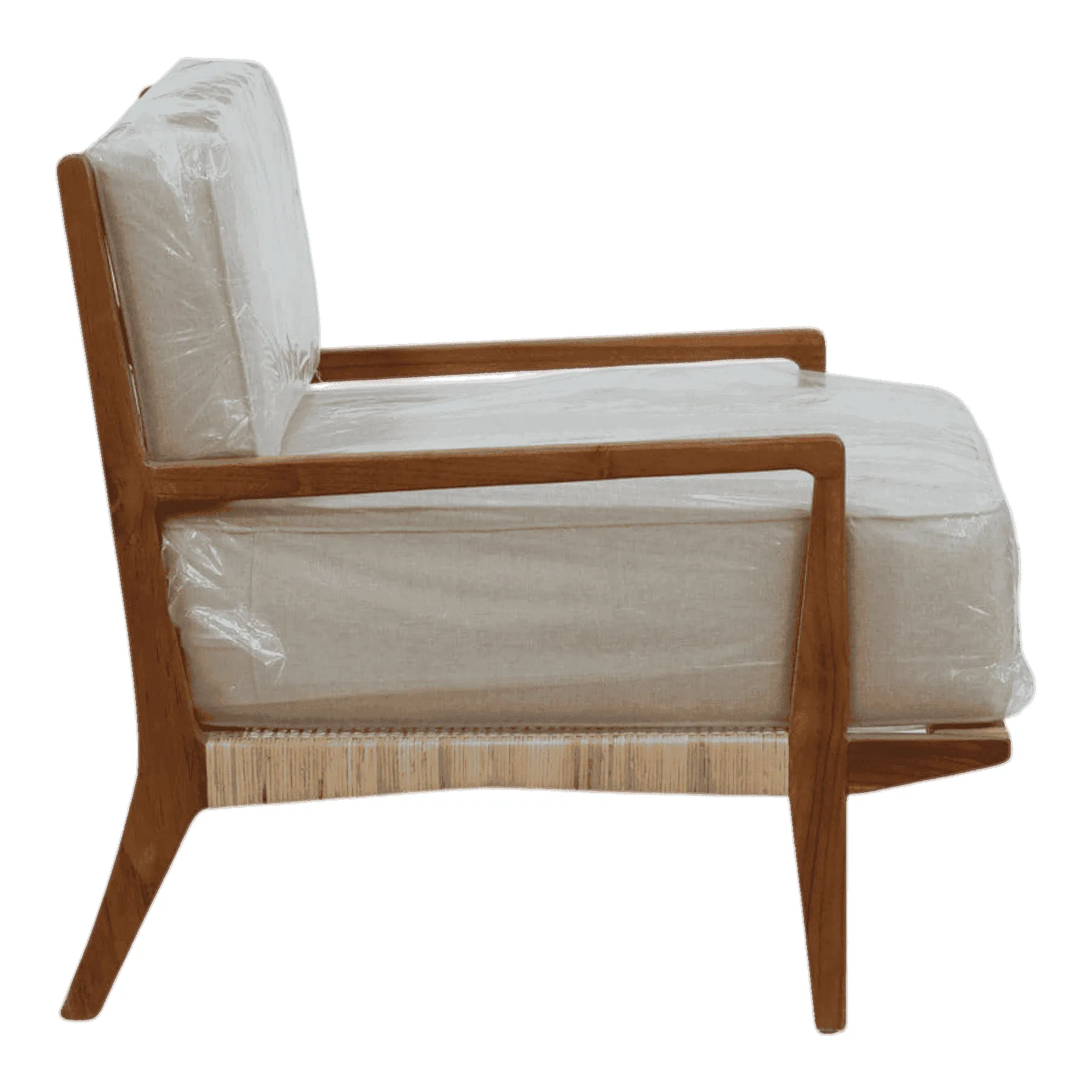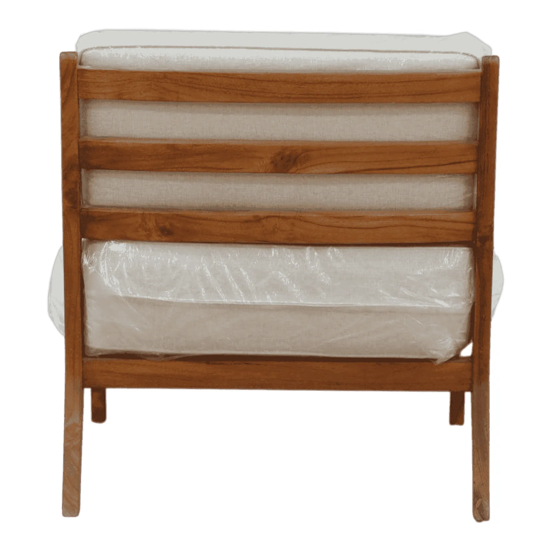 Primary Frame: Grade A Teak | Joinery: Mortise and Tenon, Slatted Construction | Finish: Natural Teak Oil | Upholster & Cushion: Sunproof® Olefin Fabric (White)