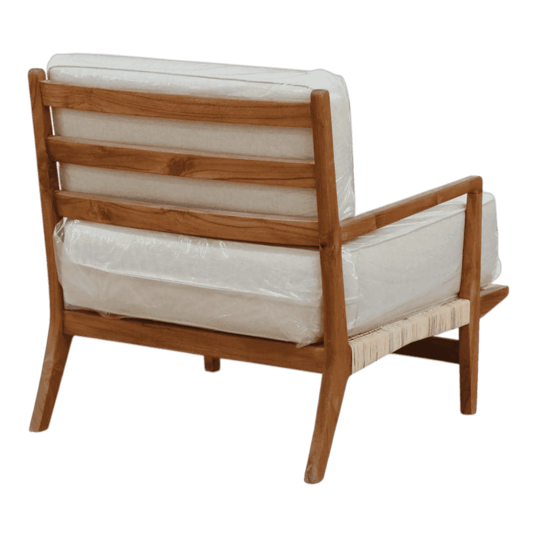 This lounge chair is the essence of modern outdoor comfort Its low, deep frame is crafted from solid teak, featuring a slatted base and sides that give it a clean, linear, and airy look Thick, boxy cushions in a crisp white fabric provide plush support for the seat and back This is a timeless, durable, and stylish piece, perfect for creating a relaxed, sophisticated lounge area on a patio or in a sunroom