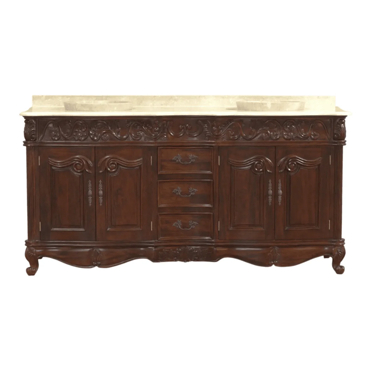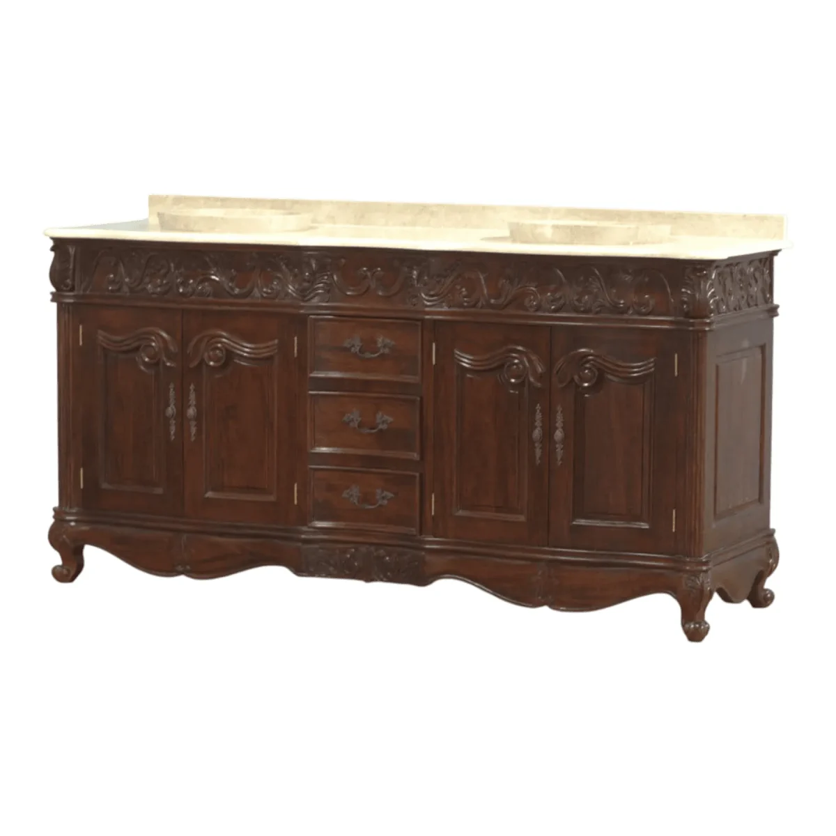 Elevate your daily rituals with this grand double-basin vanity cabinet that serves as a monument to luxury and functional artistry The expansive marble top provides a cool and durable surface for your finest apothecary items while the deep mahogany cabinet below offers organized storage for every necessity Hand-carved floral scrolls and ornate hardware details transform this essential bathroom fixture into a piece of fine furniture that would be at home in a world-class hotel or a private estate The rich dark wood finish creates a stunning contrast against the light stone top providing a balanced aesthetic that is both masculine and graceful Designed for shared spaces that do not wish to compromise on individual luxury this vanity offers the perfect blend of historical charm and modern plumbing compatibility ensuring your home remains a sanctuary of high-end design and personal comfort for years to come