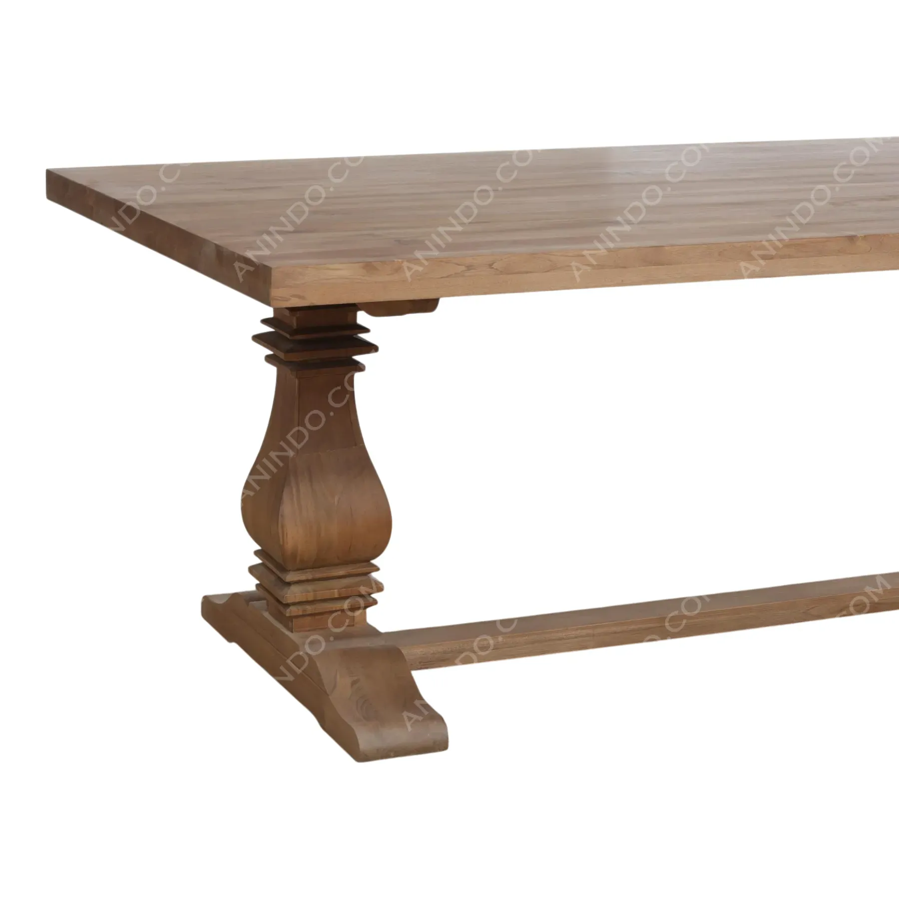 Ground your dining space with substance and heritage. This magnificent trestle table is crafted from solid, natural-finished wood, showcasing its rich, warm grain. The design is anchored by two large, masterfully-turned balustrade pedestals, giving it a sense of history and permanence. A sturdy floor-level stretcher connects the bases, ensuring stability for generations. This is a timeless, rustic-yet-elegant centerpiece for feasting and family gatherings.