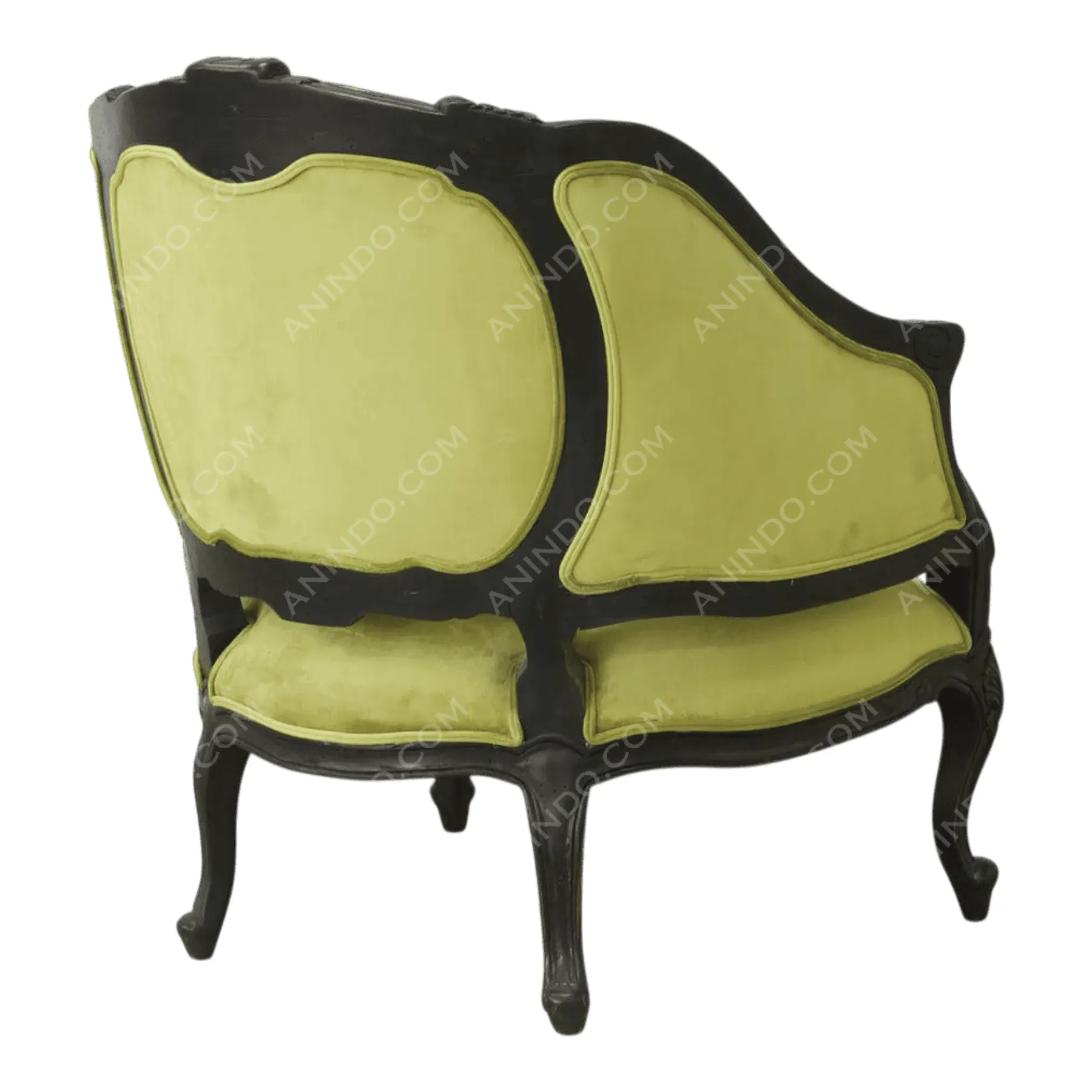 Primary Frame: Solid Mahogany | Joinery: Hand-carved, Mortise and Tenon | Finish: Ebonized Lacquer | Upholstery: Chartreuse/Olive Polyester Velvet