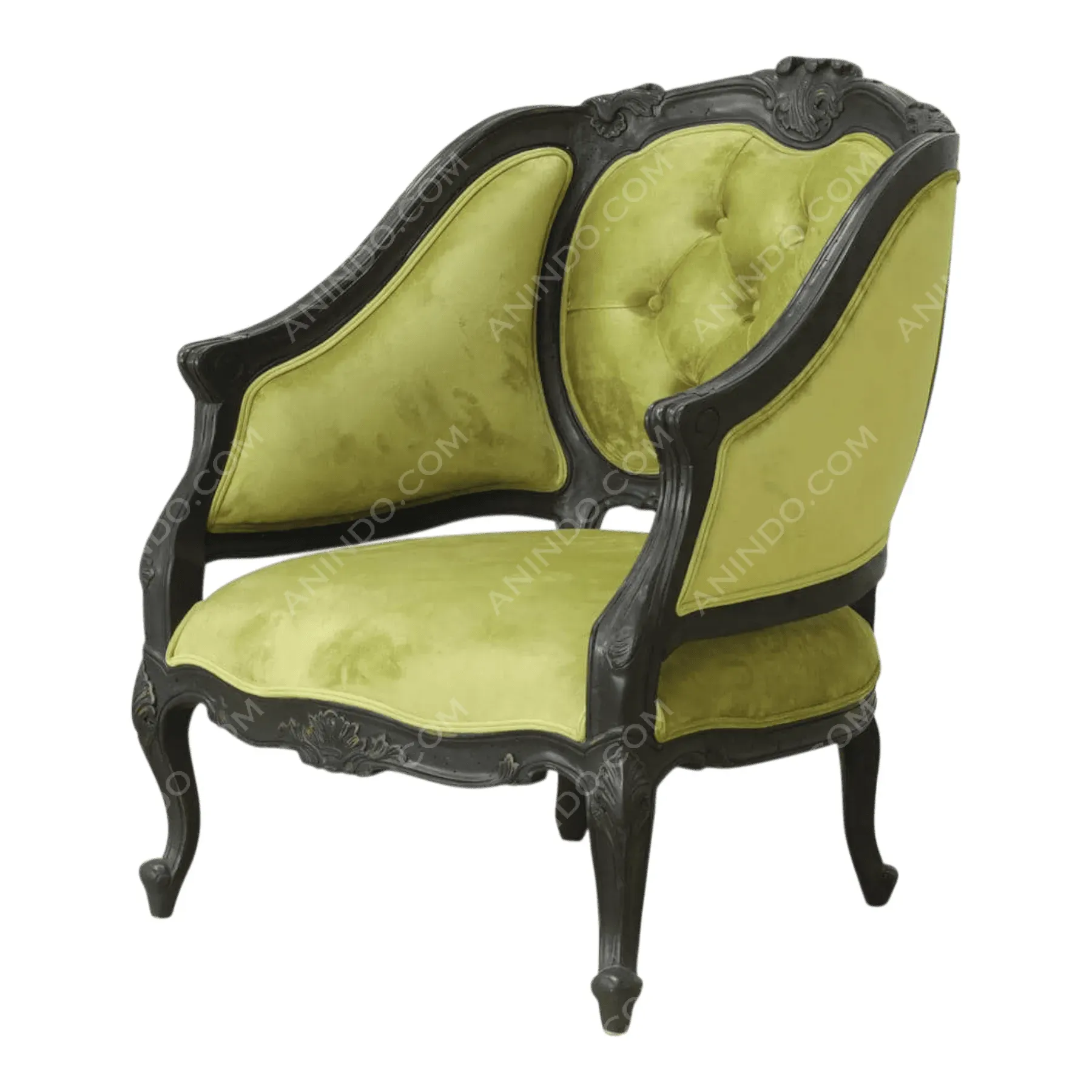 This is a chair of dramatic contrasts, blending opulent Baroque form with a daring, modern color palette The intricately hand-carved solid wood frame is finished in a deep ebonized black, featuring graceful cabriole legs and a detailed crest Its winged sides and back are upholstered in a striking, luminous chartreuse velvet The backrest features classic deep button-tufting, adding a layer of plush, historical texture This is not just a seat; it is a theatrical statement piece, perfect for an eclectic living room or a luxurious study It demands attention and exudes a confident, gothic-inspired glamour