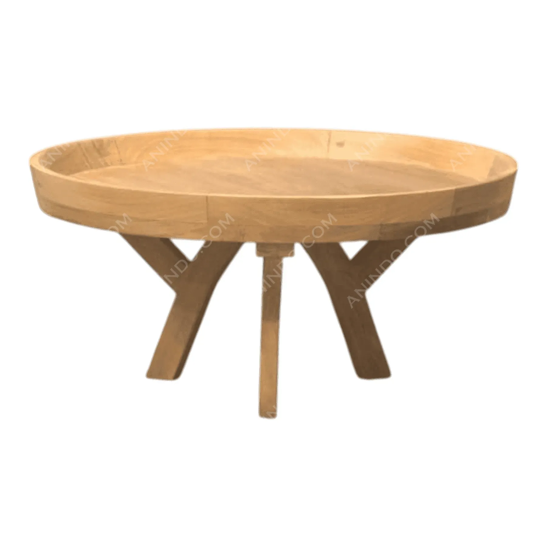 Define your living area with this sculptural teak coffee table characterized by its functional tray-style top The raised lip edge not only adds a sophisticated design element but also prevents items from sliding off making it practical for everyday use Supported by a geometric tripod base with intersecting angular legs this table showcases the raw beauty of solid wood grain Stripped of unnecessary ornamentation it stands as a testament to modern craftsmanship and organic materials