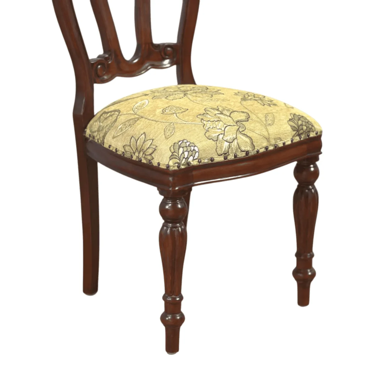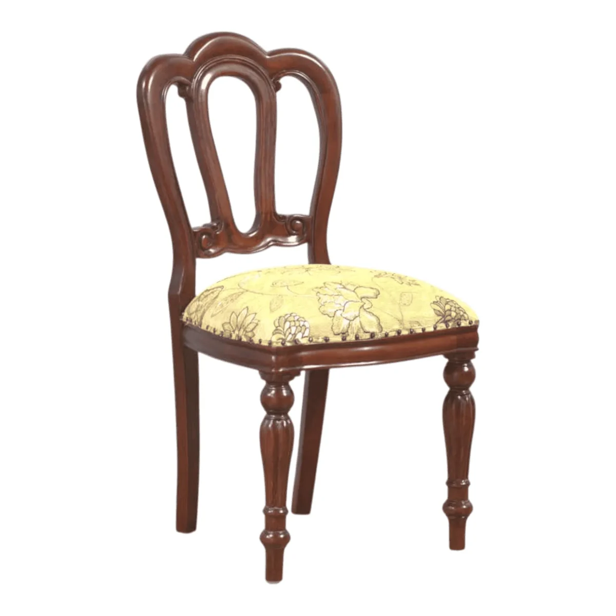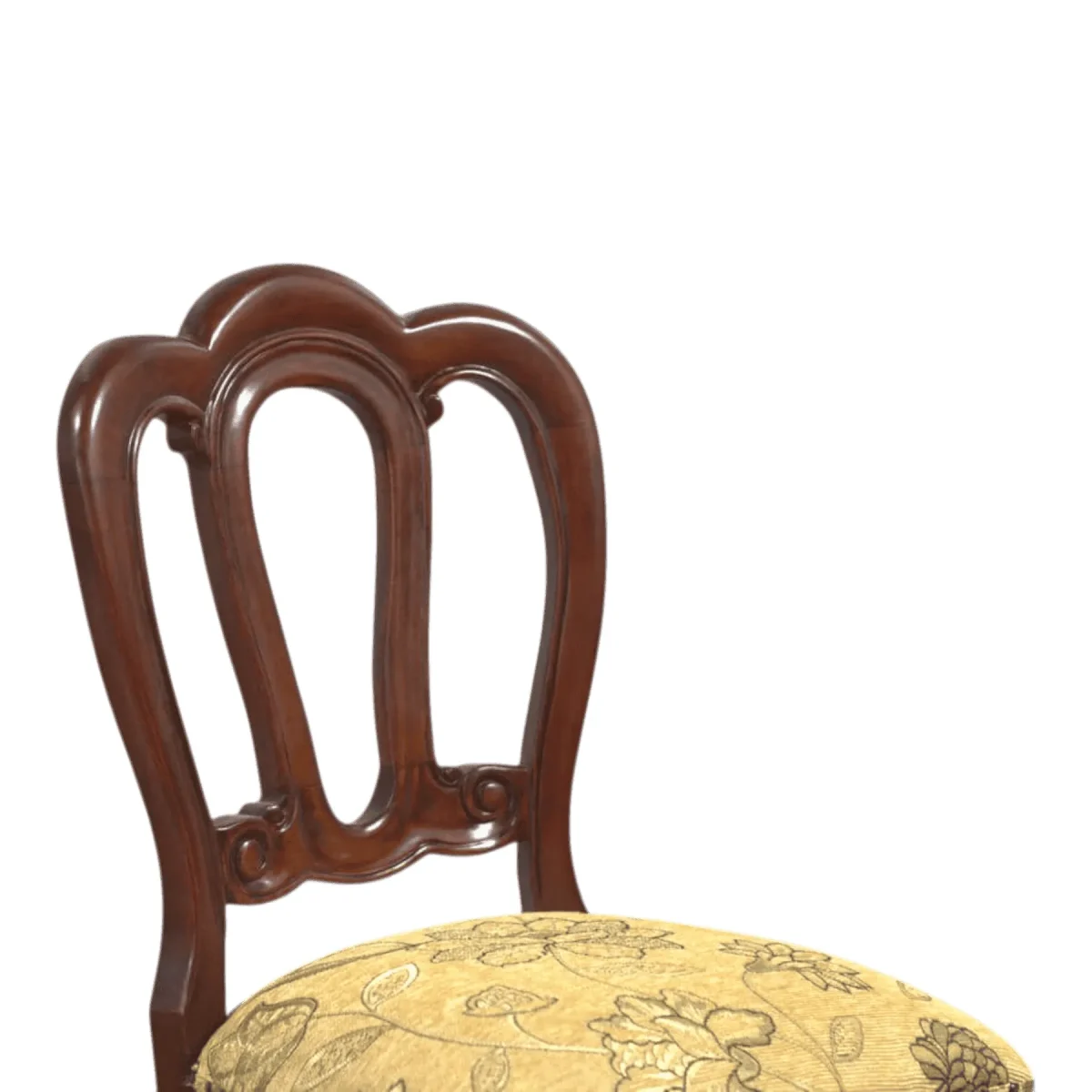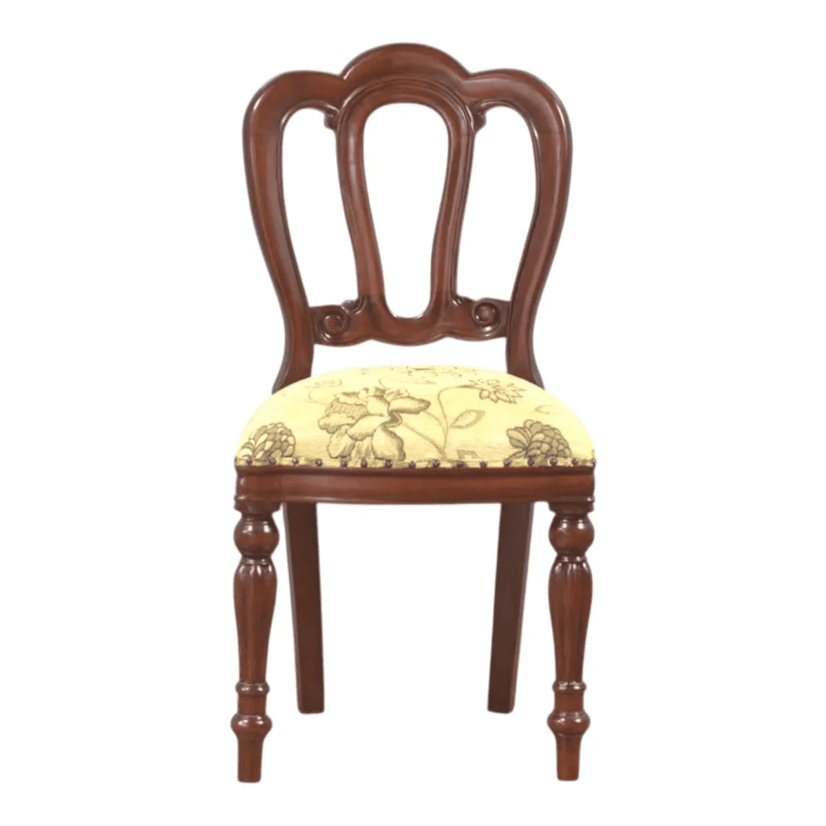 Infuse your living space with the delicate charm of the Victorian era through this masterfully carved triple-loop back chair The backrest features three elegant interlocking loops that provide a sense of transparency and lightness while maintaining structural strength The seat is generously padded and covered in a luxurious pale yellow fabric adorned with a subtle sage green botanical pattern Delicate brass nailhead trim secures the upholstery emphasizing the artisanal attention to detail Supported by expertly turned legs with ringed accents this chair acts as a sophisticated accent for a bedroom vanity or a quiet reading nook in a formal parlor Crafted from premium mahogany it offers both aesthetic grace and the enduring quality of a future heirloom