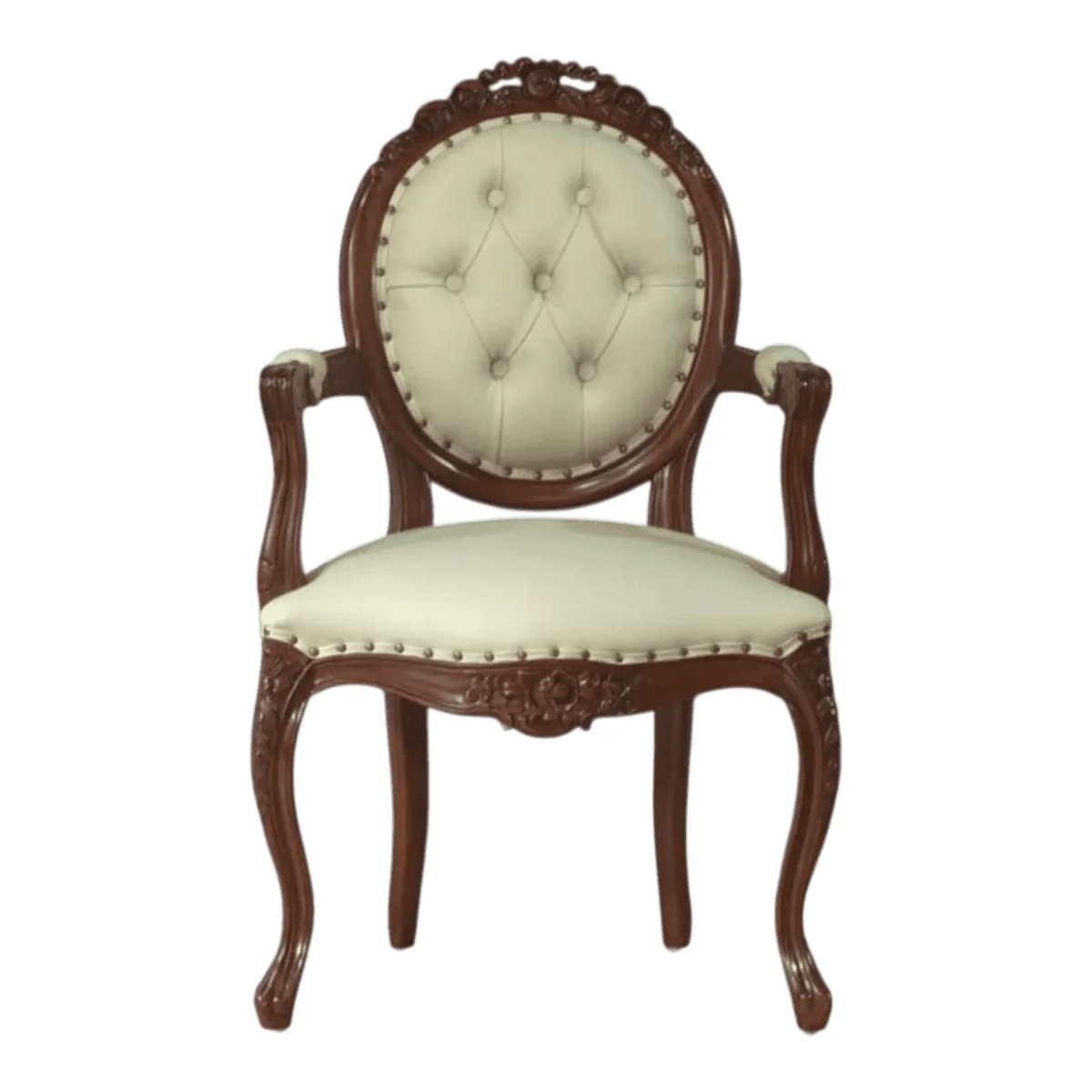 Create a cozy reading nook filled with vintage charm with this classic tufted armchair that combines the warmth of natural wood with the elegance of cream-toned upholstery The deep button-tufting on the oval backrest provides not only a beautiful texture but also a supportive and comfortable cradle for your body as you relax after a long day The rich mahogany frame is finished in a warm truffle brown that highlights the natural beauty of the wood grain while the hand-carved floral details on the knees and crest rail add a touch of artisan luxury Padded armrests offer additional comfort and a sense of enclosure making this chair the perfect spot for intimate conversations or quiet reflection Small brass nailhead trim outlines the fabric edges providing a clean and tailored finish that speaks to the high-quality construction and attention to detail found throughout this timeless piece of furniture
