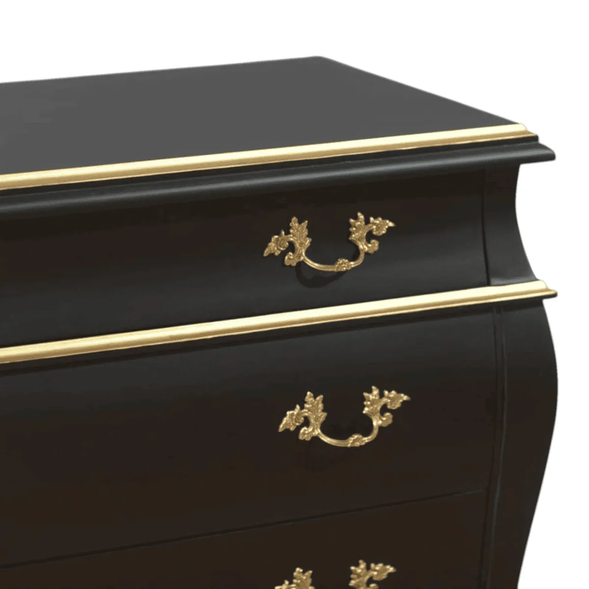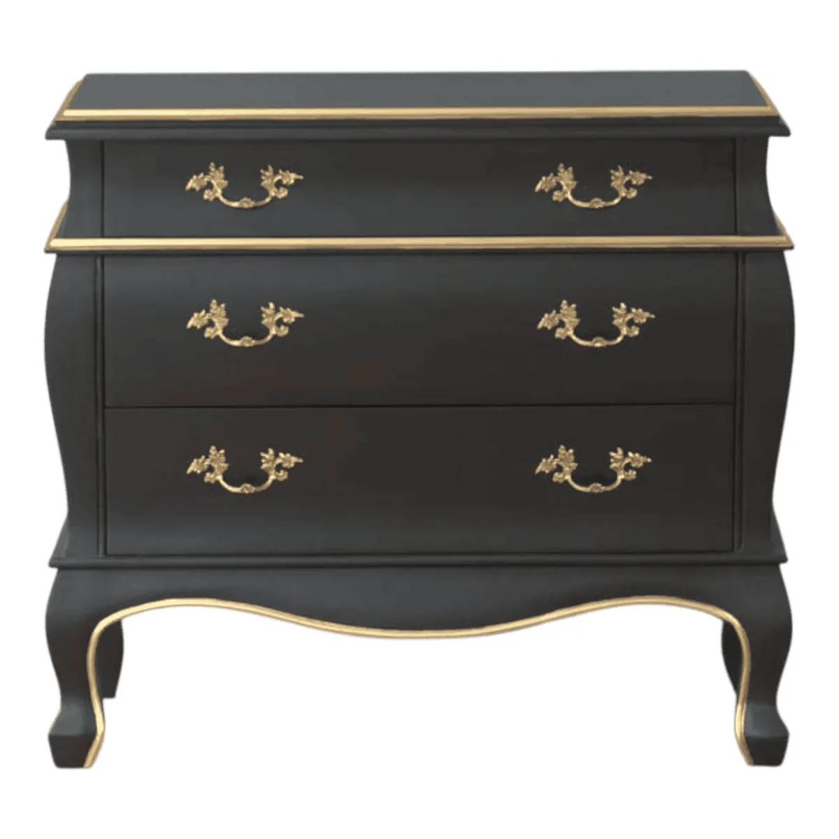 Capture the essence of 18th-century French flair with this exquisitely shaped bombe comchest The dresser features a dramatic serpentine silhouette with gracefully bowed sides and a curvaceous front that flows seamlessly into slender cabriole legs Finished in a sophisticated matte charcoal the piece is elevated by striking gold leaf accents that trace its elegant contours and highlight the ornate brass pull handles The three-drawer configuration provides ample storage for textiles or personal items making it as functional as it is decorative This commode acts as a bridge between antique charm and modern moodiness perfect for an entryway or a luxurious master suite