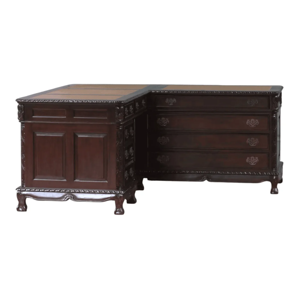 This expansive workspace offers unparalleled organization and surface area for the modern leader crafted from rich mahogany with traditional paneling details Featuring integrated storage drawers and a wrap-around design it provides a seamless transition between computer tasks and paper management The leather-inlaid top adds a layer of tactile luxury while the ornate base molding reflects a heritage of quality and stability built to last for decades This desk is not just furniture but a professional partner that organizes your workflow within a frame of classic architectural beauty