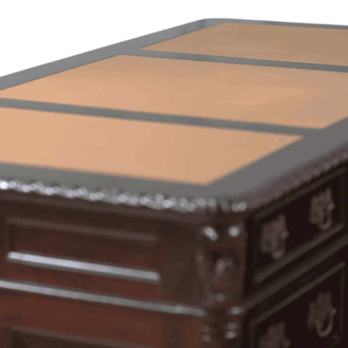 Base Wood: Dark Reddish-Brown Mahogany Surface Finish: Caramel Tan Leather Inlay Accents: Antique Bronze Drawer Pulls
