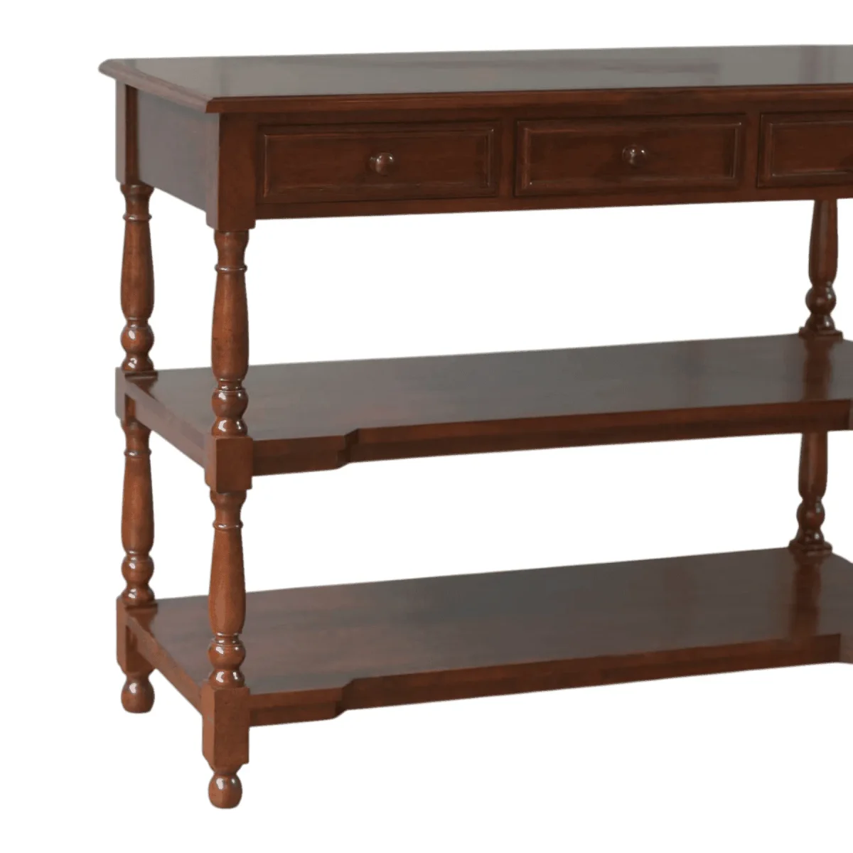 This multi-functional console table brings the warmth of traditional wood craftsmanship into your living space with its rich dark finish and tiered storage design Featuring three top drawers for smaller items and two expansive lower shelves this piece is perfect for displaying curated collectibles or organizing media equipment The turned legs add a sense of historical rhythm to the silhouette while the clean lines of the shelves keep the look grounded and organized Crafted from high-quality teak this console offers a durable and reliable surface for a large television or a decorative mirror arrangement making it a versatile addition to a living room dining area or grand foyer