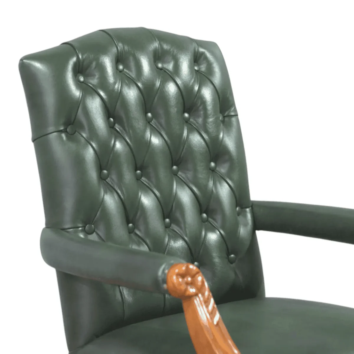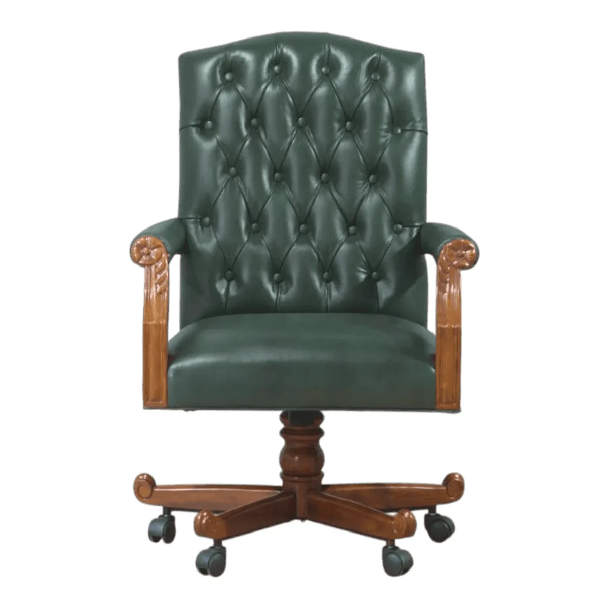 Command your workspace with an air of absolute authority and unparalleled comfort in this premium leather executive chair designed for the modern visionary who appreciates historical elegance the deep emerald green upholstery is meticulously hand-tufted to provide ergonomic support while exuding a sense of prestige and timeless sophistication set upon a sturdy hand-carved mahogany base the chair features intricate floral scrollwork on the armrests that speaks to a high level of artisanal craftsmanship that is rare in contemporary office furniture whether you are signing important documents or contemplating your next big move this chair provides the physical ease and psychological confidence needed for peak performance transform your office into a stately study where every detail reflects your commitment to quality and your eye for classic design excellence