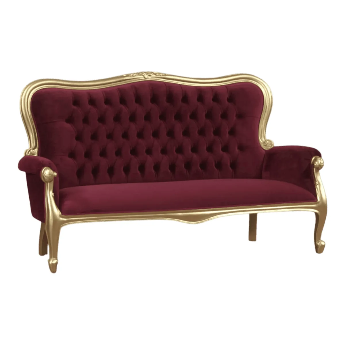 Experience the ultimate in theatrical luxury with this breathtaking settee that pairs deep ruby velvet with a shimmering gold-finished frame the high tufted backrest provides a regal backdrop for social gatherings or private relaxation featuring deep buttoning that creates a rich play of light and shadow across the plush fabric surface the frame follows a graceful serpentine line along the top and bottom with delicate cabriole legs that elevate the seat to a height of pure elegance this sofa is designed to be the centerpiece of a formal salon or a luxury lounge where its bold color palette and intricate carvings can truly shine the velvet upholstery is chosen for its durability and tactile softness ensuring that every moment spent seated feels like a royal audience this is more than a sofa it is an invitation to inhabit a world of drama and comfort