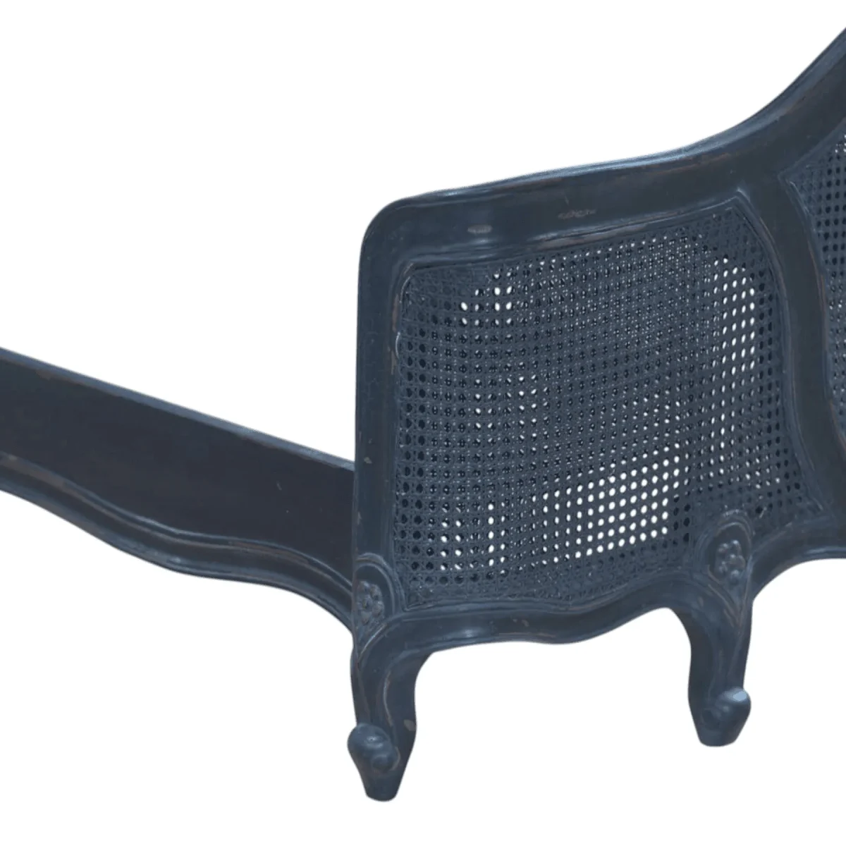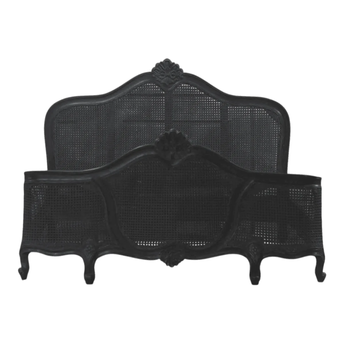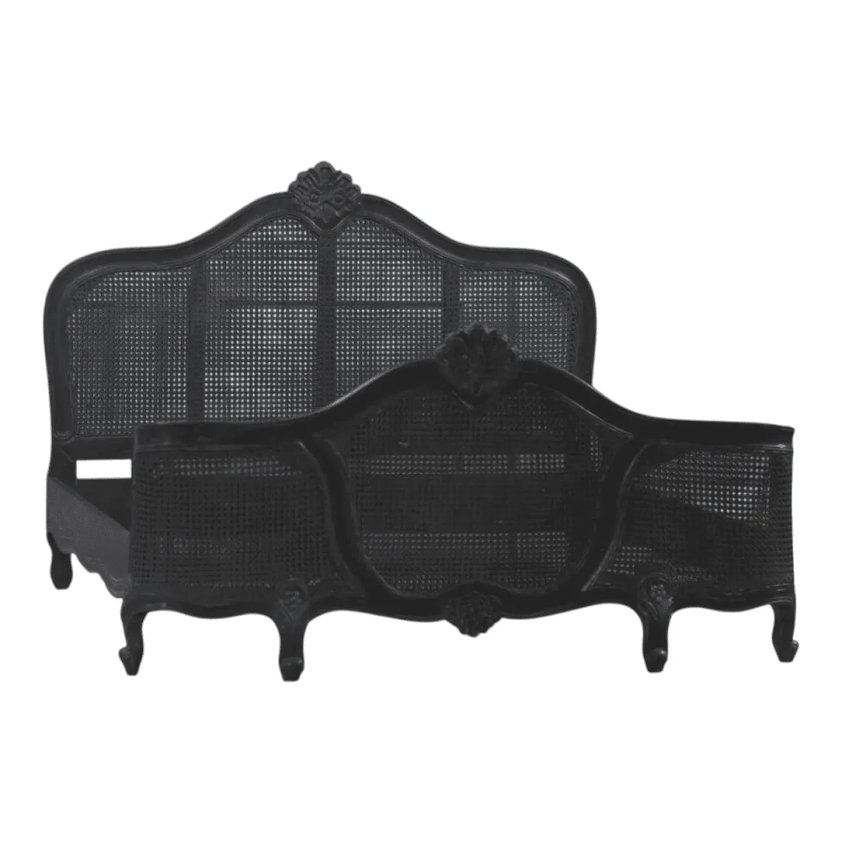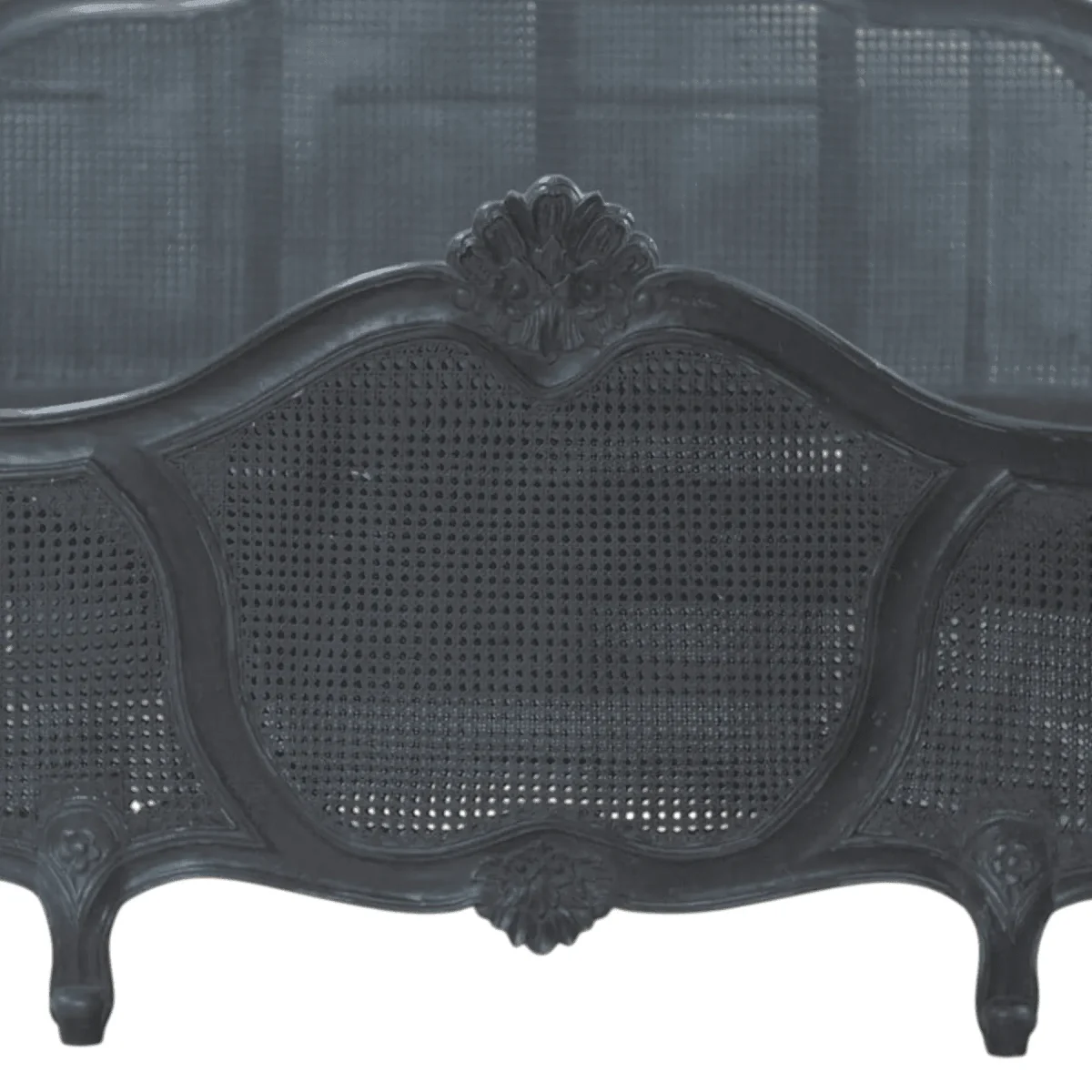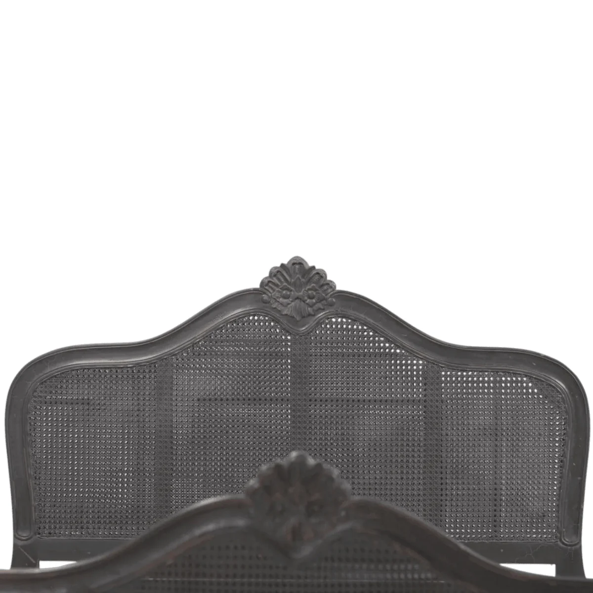 Bold architectural lines meet delicate texture in this ebonized interpretation of a classic French silhouette This bed frame commands attention with its monochromatic black palette transforming the traditional Provincial style into a modern gothic masterpiece The expansive headboard features masterfully woven cane panels that offer a rhythmic texture against the smooth hand-carved wooden frame Elevated by quintessential cabriole legs and adorned with hand-sculpted floral medallions this piece bridges the gap between old-world heritage and contemporary interior trends The dark finish highlights the sophisticated curves of the scalloped rails making it an ideal choice for high-contrast interior designs that value both heritage craftsmanship and a moody avant-garde aesthetic