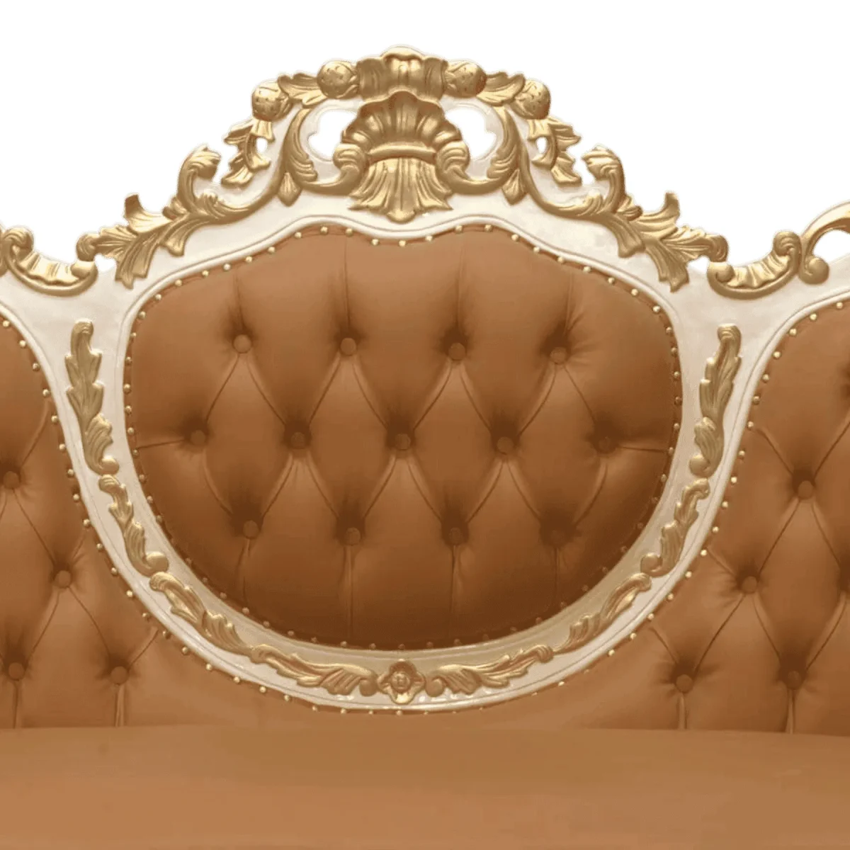 Immerse yourself in the opulence of the Baroque era with this regal sofa featuring an elaborate gold-leaf frame and curvaceous silhouette The triple-hump camelback design is accentuated by intricate scrollwork and floral crests hand-carved by master artisans Upholstered in a rich cognac tufted leather (or high-grade leatherette) it provides a warm grounding contrast to the bright gilding offering a seat that feels as majestic as it looks
