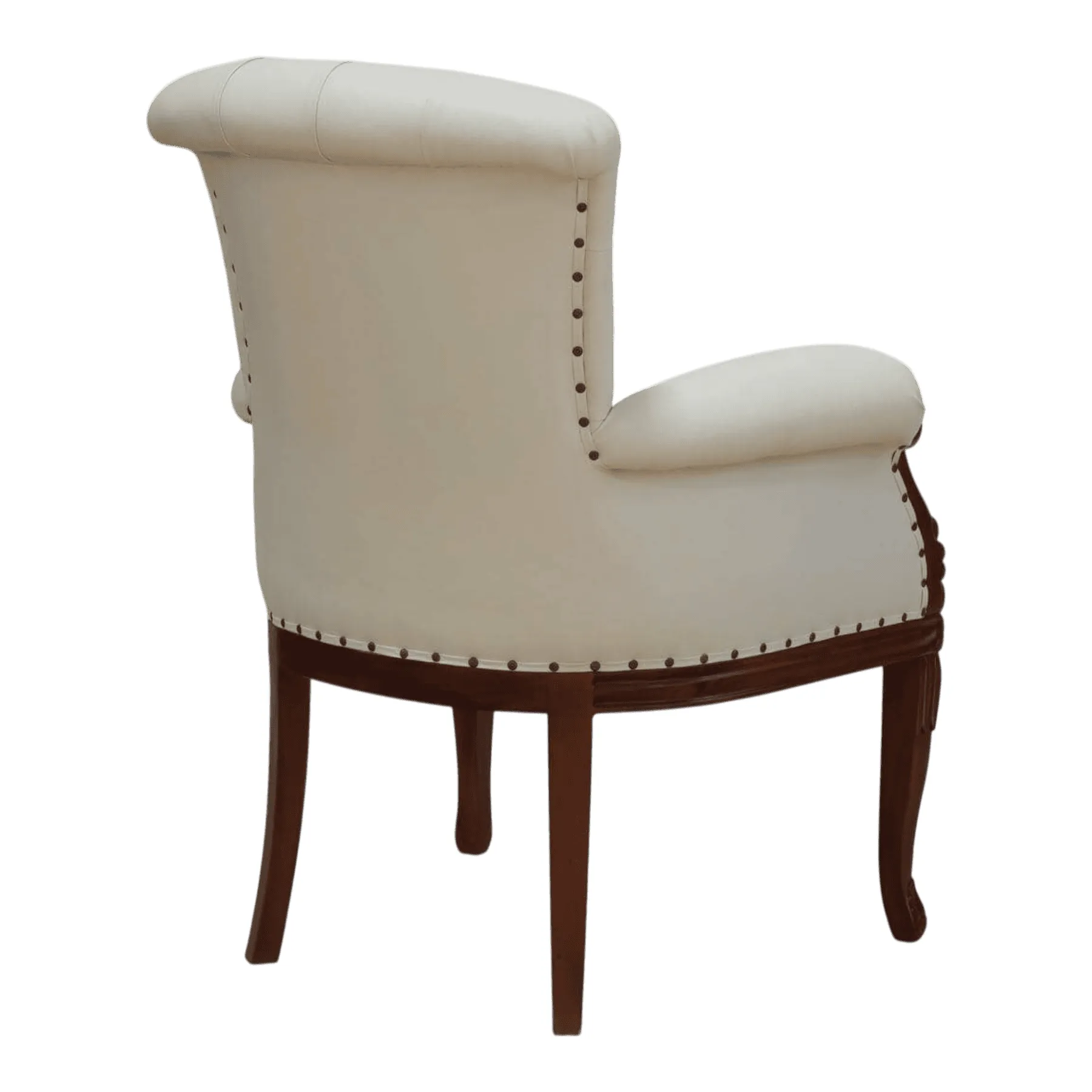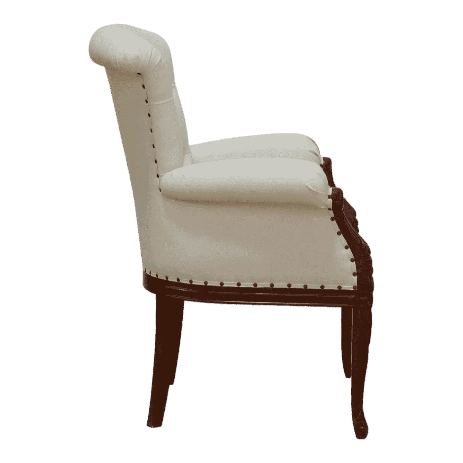 Primary Frame: Hand-Carved Mahogany | Joinery: Traditional | Finish: Dark Walnut Stain | Upholster & Cushion: Cream Linen with Brass Nailheads