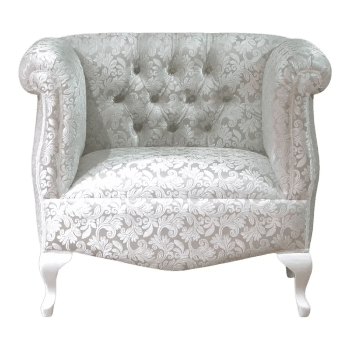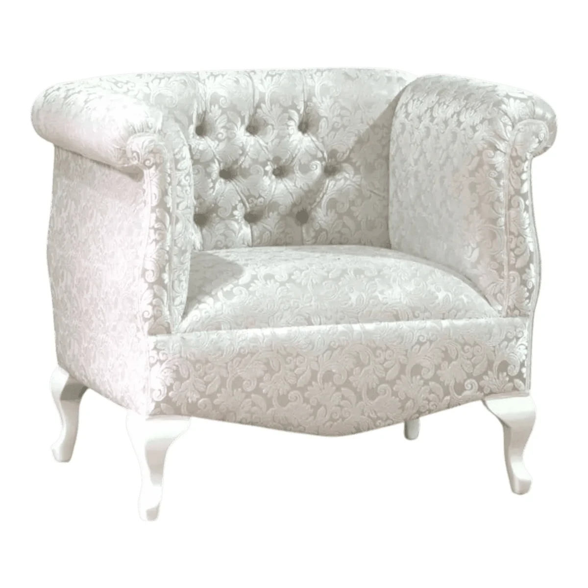Embrace the soft embrace of the Pearl Cloud barrel chair a piece that merges modern comfort with classical French flair The wrap-around silhouette features a deep-buttoned tufted backrest that flows seamlessly into high rolled arms creating a cozy cocoon for relaxation Upholstered in a luminous silver-white damask with subtle floral weaving the fabric catches the light to reveal hidden depths of texture The chair sits upon elegant white cabriole legs providing a sturdy base with a feminine touch Its compact yet plush design makes it a versatile choice for a luxury dressing room a chic nursery or as a pair of conversation chairs in a contemporary salon
