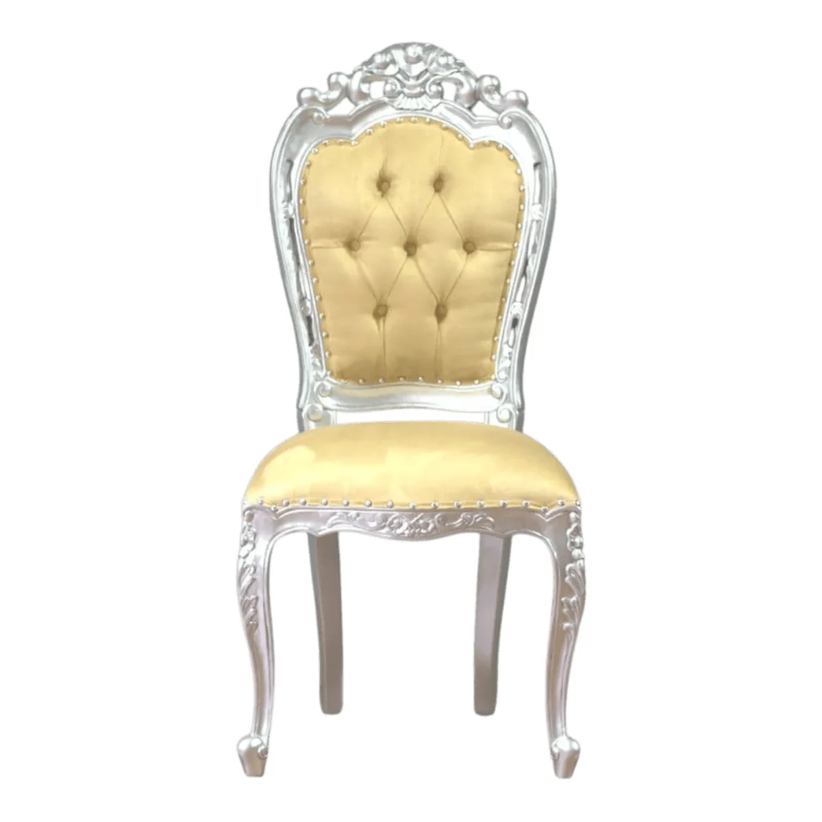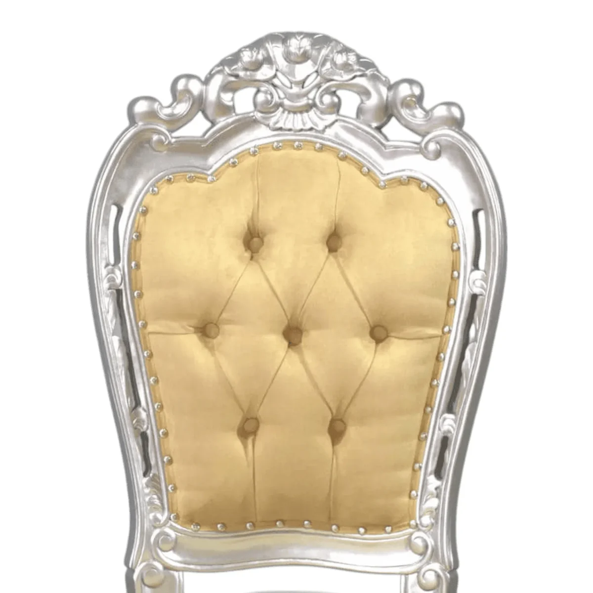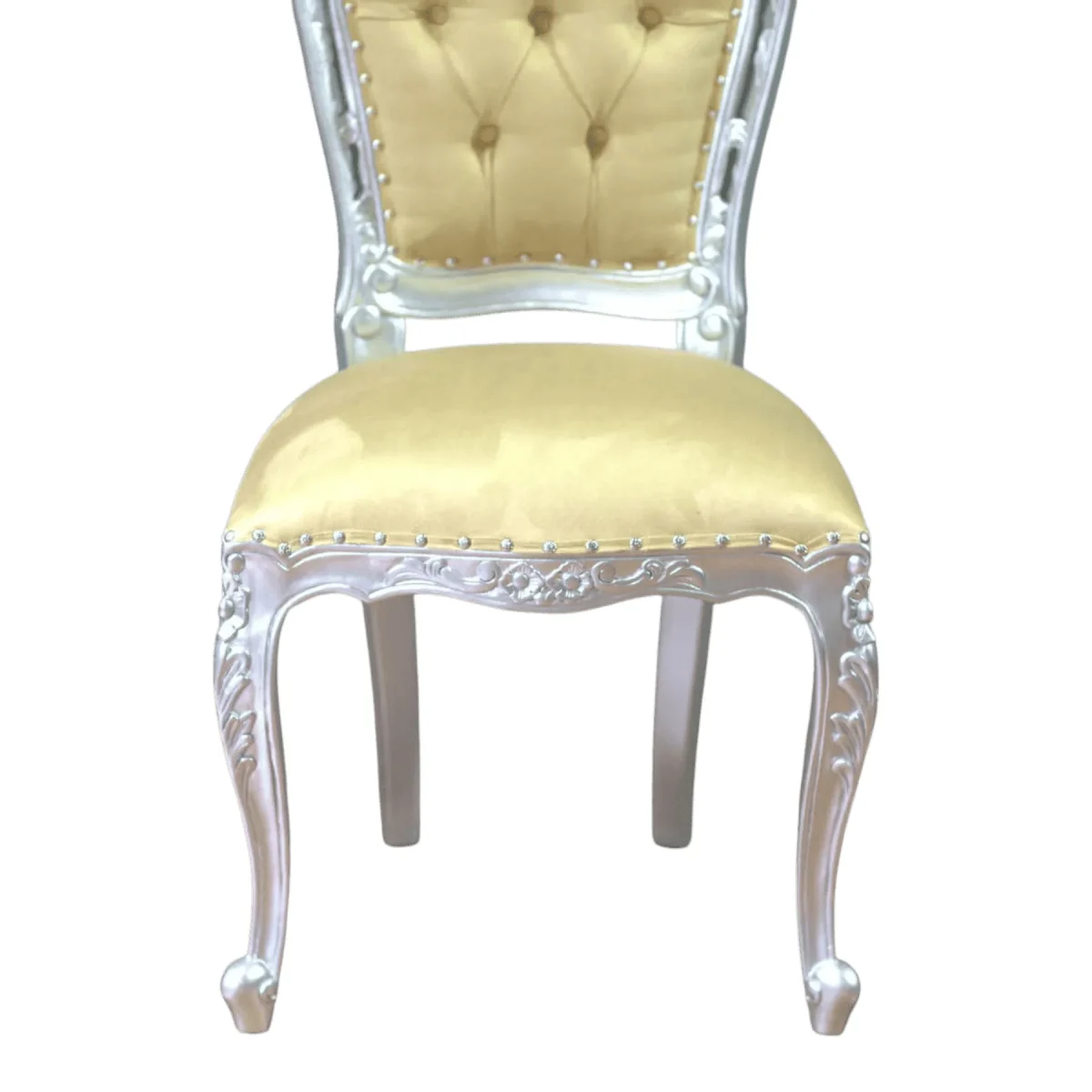 Brighten your interior landscape with the sun-drenched elegance of this silver-framed accent chair featuring warm honey-gold upholstery The chair’s frame is a celebration of the Rococo spirit with fluid hand-carved details along the legs apron and high-back crest all finished in a cool metallic silver leaf This silver exterior provides a sophisticated counterpoint to the cream velvet upholstery which glows with a warm radiance in any light The button-tufted backrest provides a classic textured look while the seat is deep and supportive enough for long-term comfort Delicate silver studs line the upholstery edge providing a refined finish that ties the metallic and fabric elements together This piece is an excellent choice for adding a pop of warm color to a modern gray-toned living room or as a glamorous seating option for a luxurious master closet