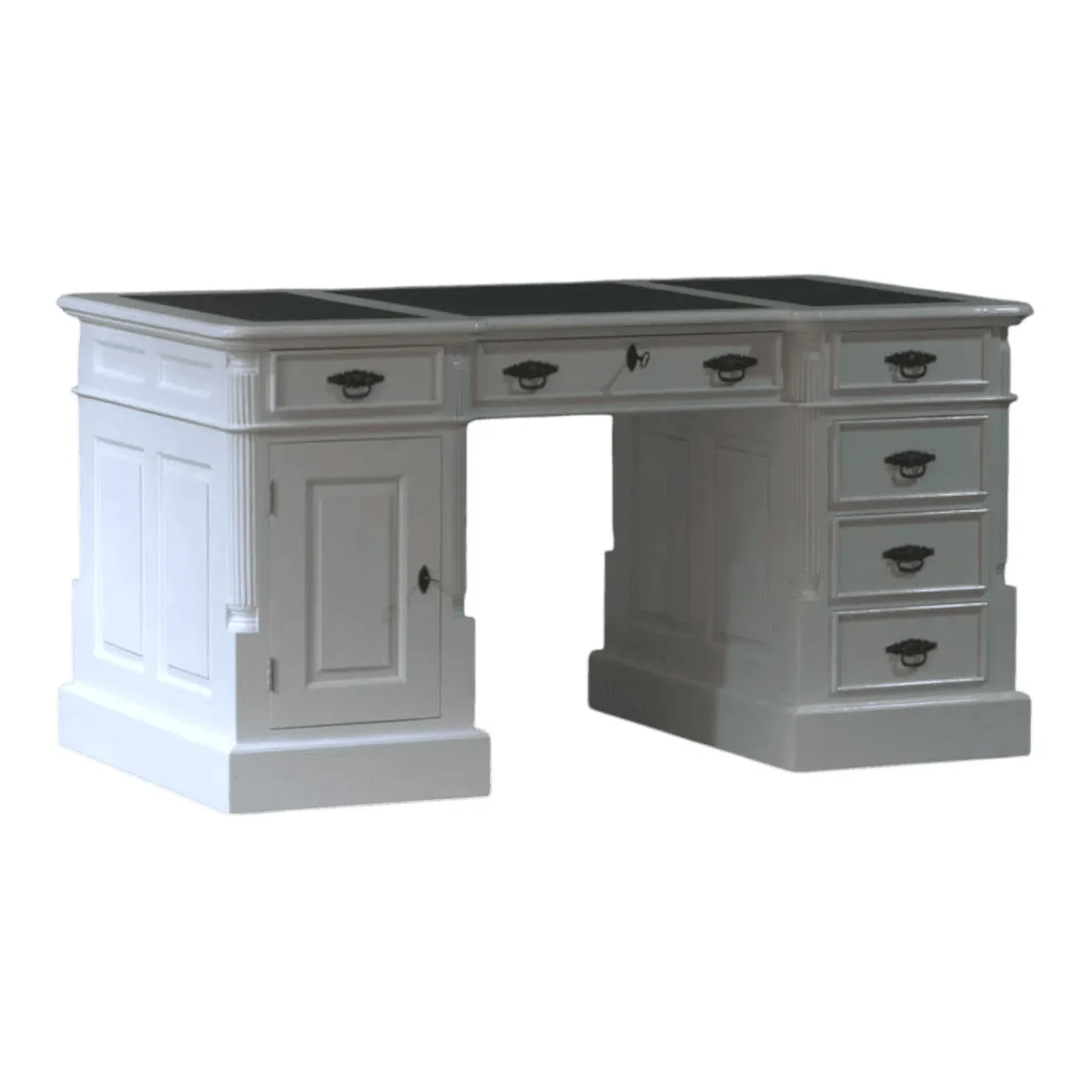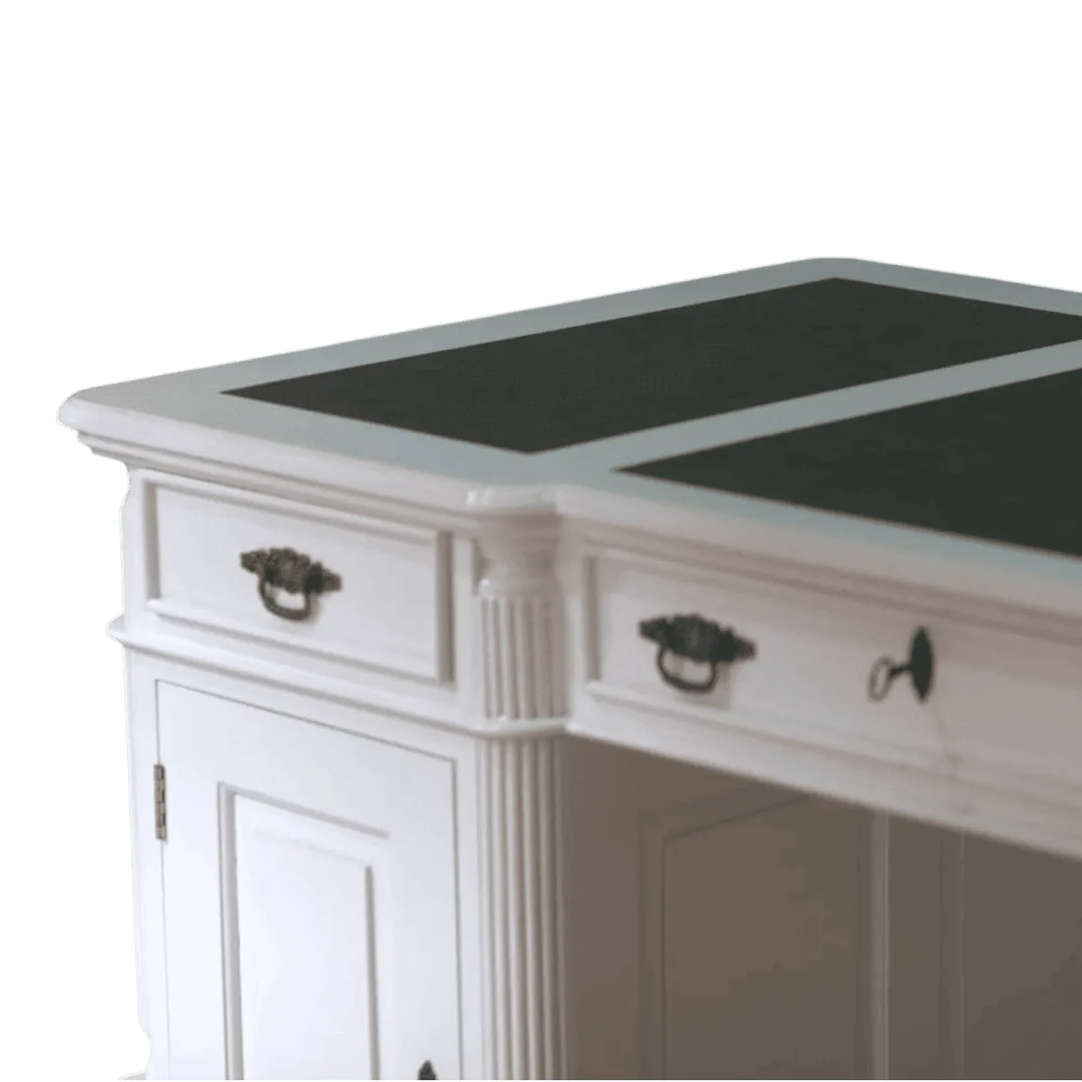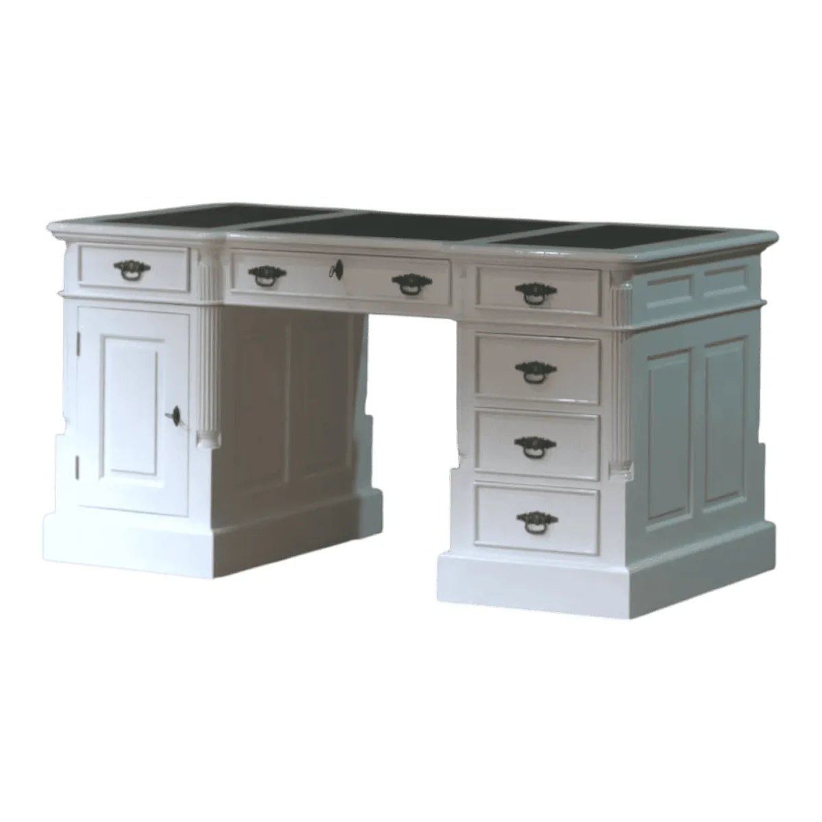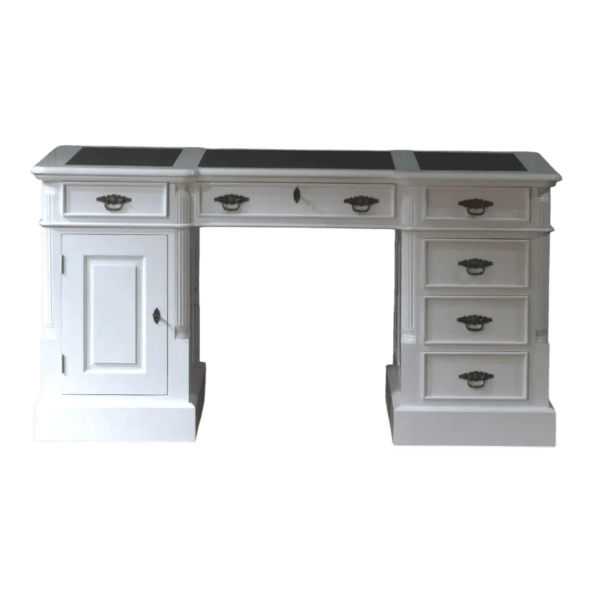 Command your workspace with this sophisticated pedestal desk finished in a crisp white lacquer that breathes air and light into any study or home office The dark inset writing surface provides a tactile and visual anchor while the ornate black handles offer a vintage touch against the clean modern finish Ample storage is provided through a combination of versatile drawers and a side cabinet for organized professional workflows