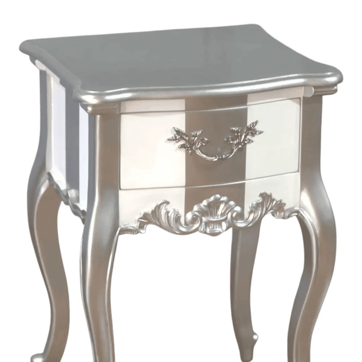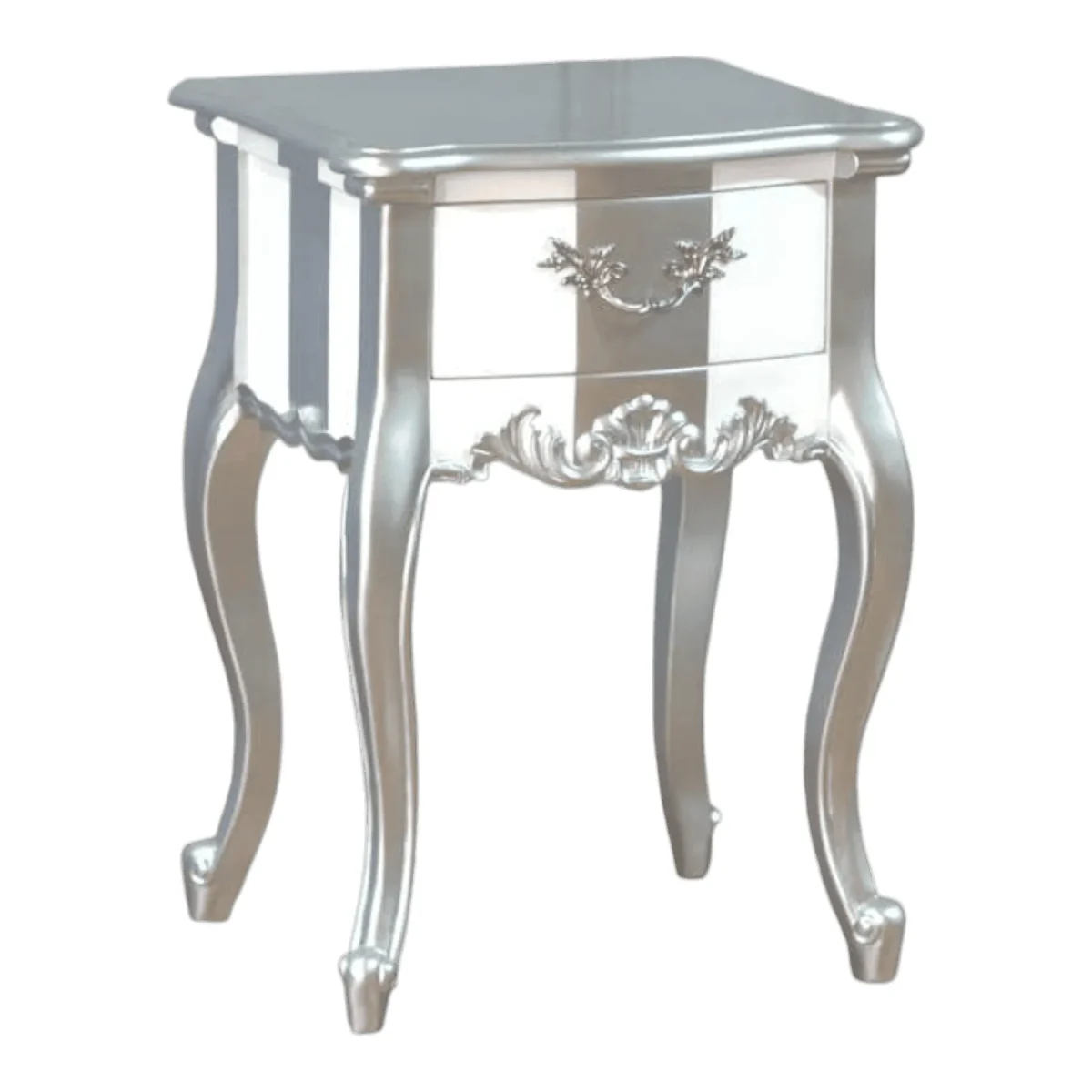 Bring a flash of brilliance to your bedside with this fully silver-finished nightstand that exudes modern glamour The elegant cabriole legs lift the piece to a comfortable height while the single drawer offers discreet storage for your evening essentials Detailed with a central floral carving and a classic metal pull handle this table captures light to brighten up dark corners and add a sense of spaciousness