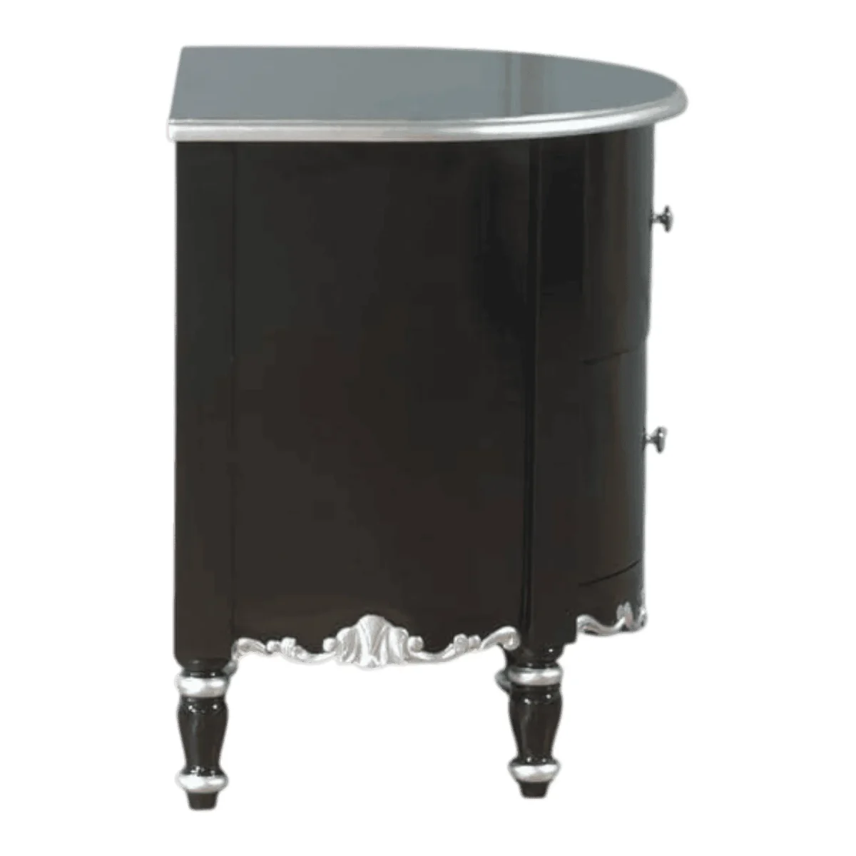 This elegant bedside companion brings a touch of dramatic sophistication to your sanctuary with its deep obsidian finish and shimmering silver highlights Designed with a graceful semi-circular silhouette, it maximizes floor space while providing ample storage through two sleek drawers The intricate hand-carved silver base and matching cabriole-style feet offer a regal foundation that transforms any bedroom into a high-end suite Perfect for holding a designer lamp or your evening essentials this piece balances dark allure with refined metallic brilliance for a truly timeless aesthetic Crafted for those who desire luxury in the details this nightstand serves as a functional masterpiece that anchors your interior design with effortless poise and nocturnal charm Enjoy the seamless blend of modern utility and classical French inspiration every morning and night in your curated home