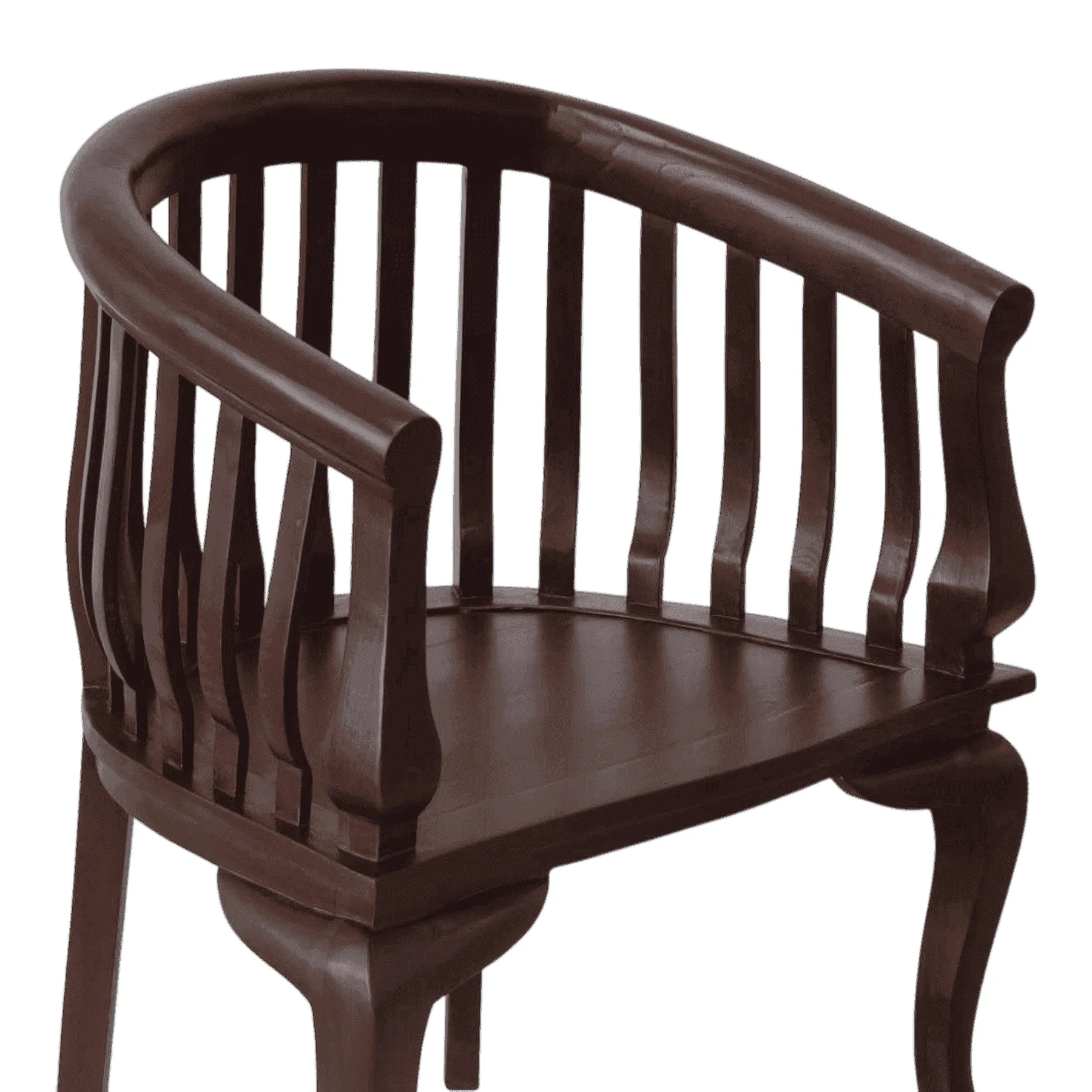 Embrace the enduring charm of this classic barrel armchair Its commanding presence is defined by a gracefully curved backrest that flows seamlessly into supportive arms, all supported by a series of fine, vertical spindles The deep, ebonized finish on solid wood lends it a formal, sophisticated air Elegant cabriole legs at the front add a touch of Queen Anne styling, softening its strong silhouette This chair is a perfect corner accent, a distinguished desk chair, or a timeless addition to a traditional living room