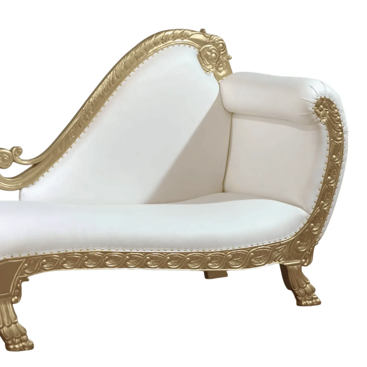 Indulge in the pinnacle of lounging sophistication with this breathtaking masterpiece that transforms any master suite into a sanctuary of high-end relaxation designed with an exquisite sweeping silhouette this piece pays homage to classical French aesthetics while providing a contemporary sense of grandeur the brilliant white upholstery is meticulously tensioned over premium padding to ensure a cloud-like seating experience that remains supportive over years of use while the hand-carved solid wood frame serves as a shimmering architectural anchor finished in a lustrous gold leaf that catches the light from every angle it is more than just a seat it is a statement of personal success and refined taste offering a perfect vantage point for morning reflections or evening repose within a curated interior landscape that demands nothing less than perfection and timeless elegance