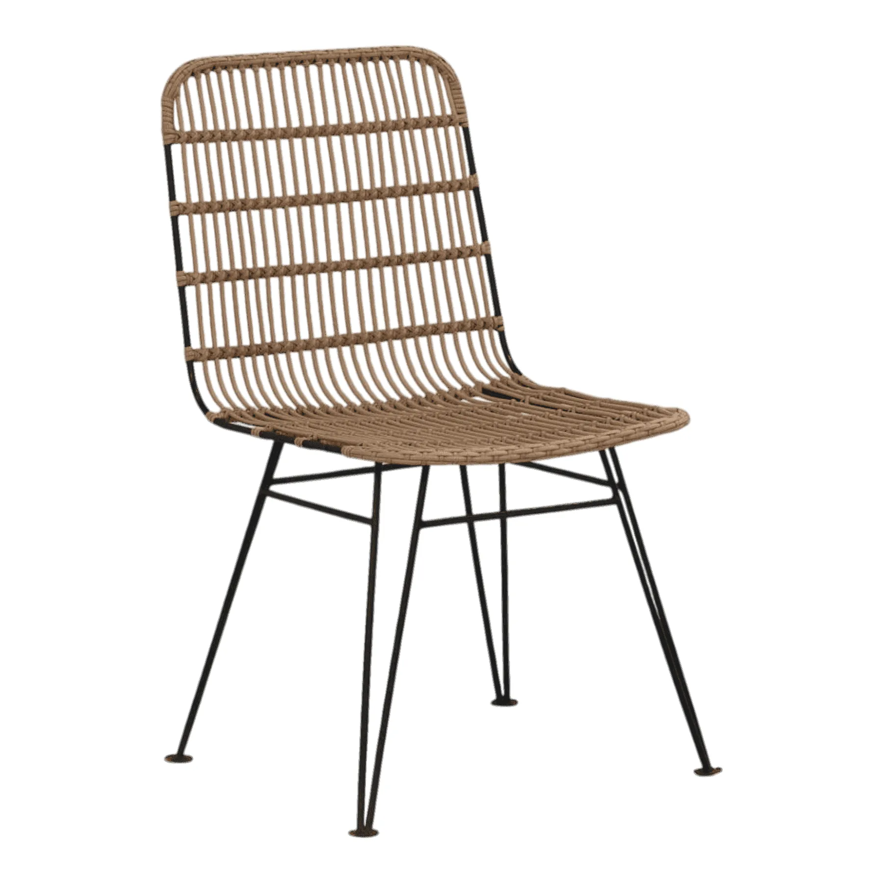 This chair blends bohemian texture with an industrial base Its seat and back are crafted from natural rattan woven onto a black metal frame The slender, splayed legs keep the design visually light, making it a stylish choice for a modern or eclectic dining room