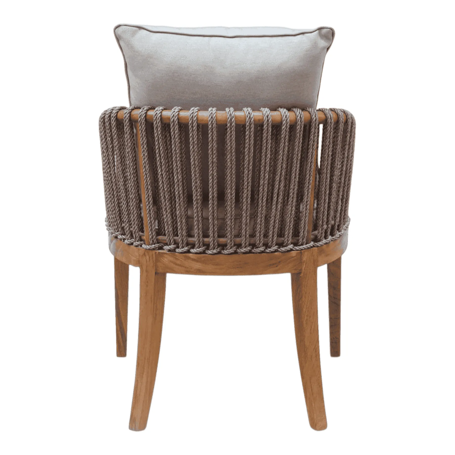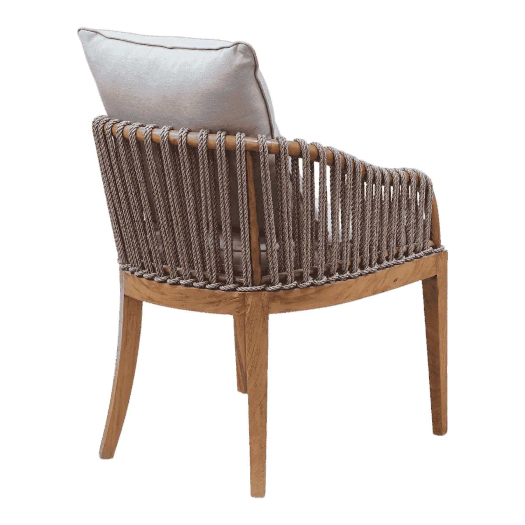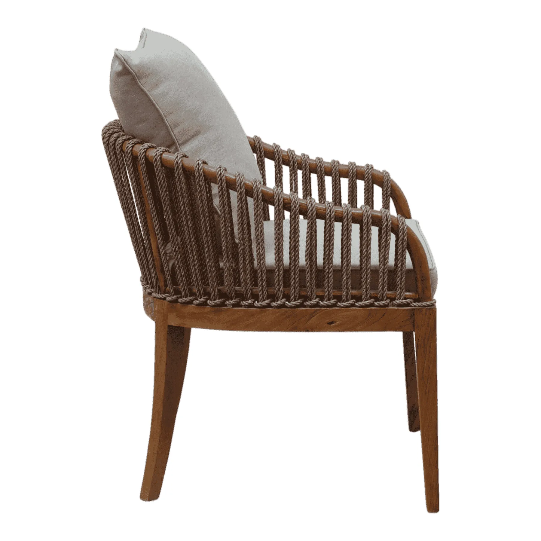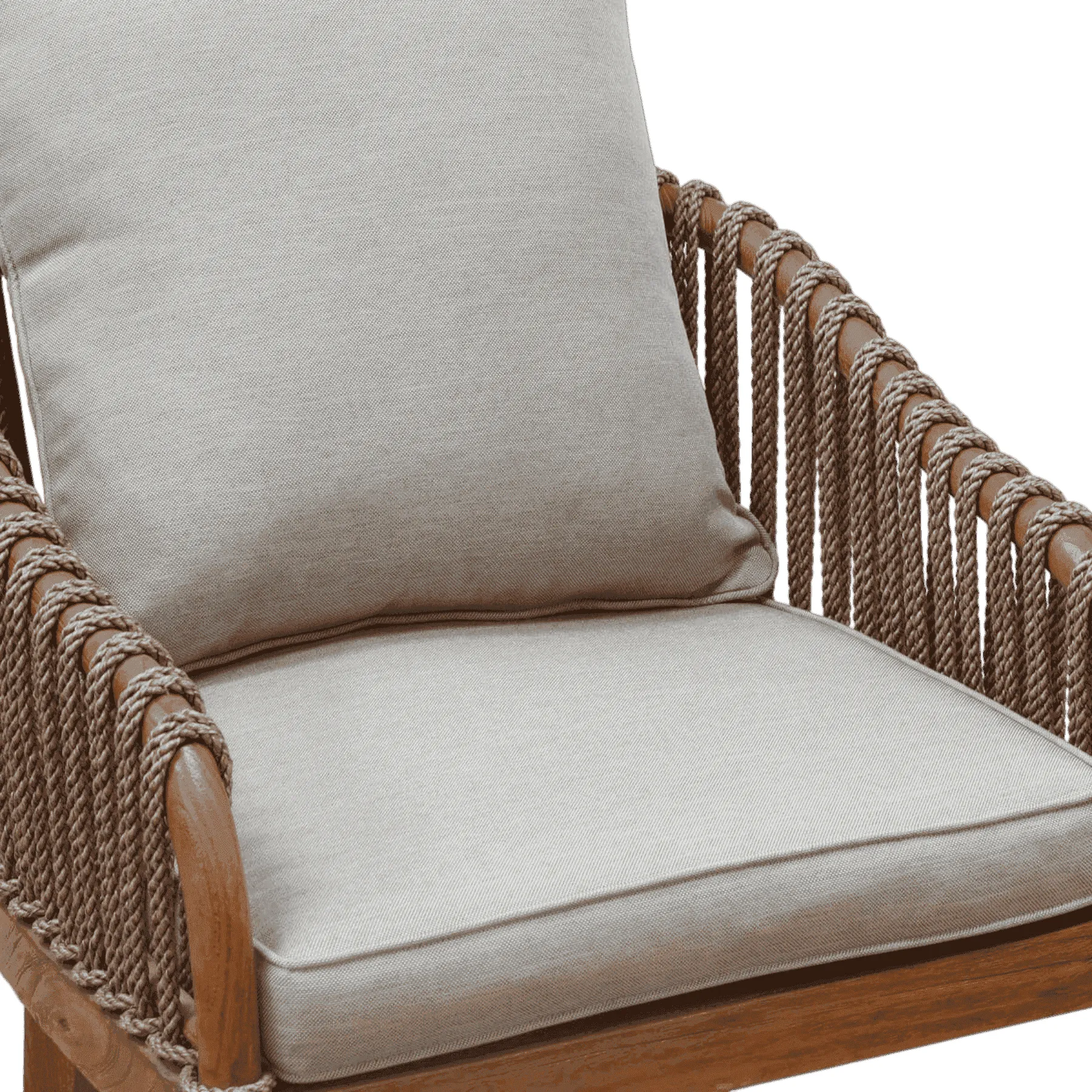 Primary Frame: Solid Wood (likely Teak or Acacia) | Joinery: Mortise and Tenon | Finish: Natural Wood Stain | Upholster & Cushion: Woven All-Weather Rope, Sunproof® Fabric Cushions (Grey)