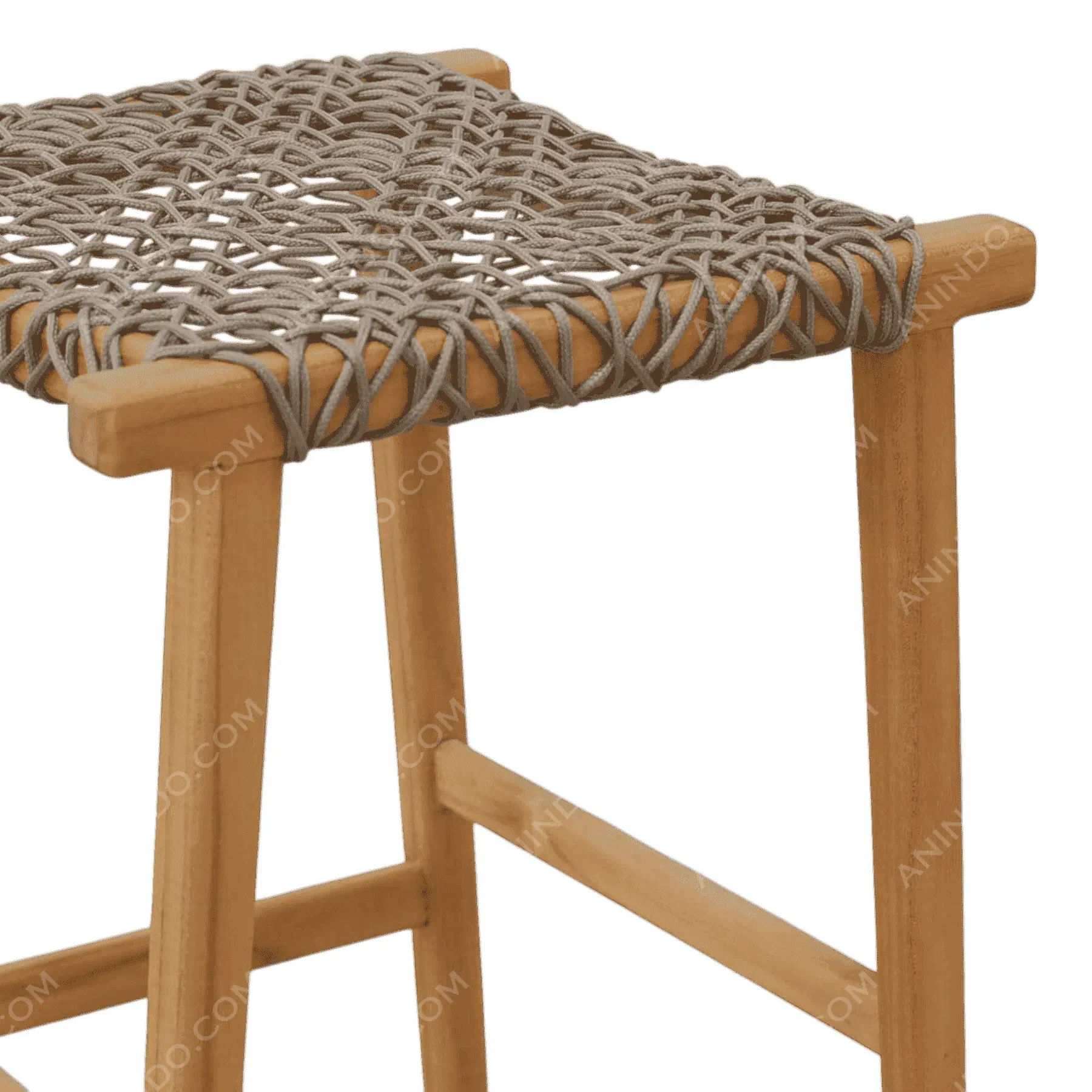 This design is a minimalist, backless stool that highlights the contrast between the smooth, solid teak frame and the intricate, textural, hand-woven rope seat