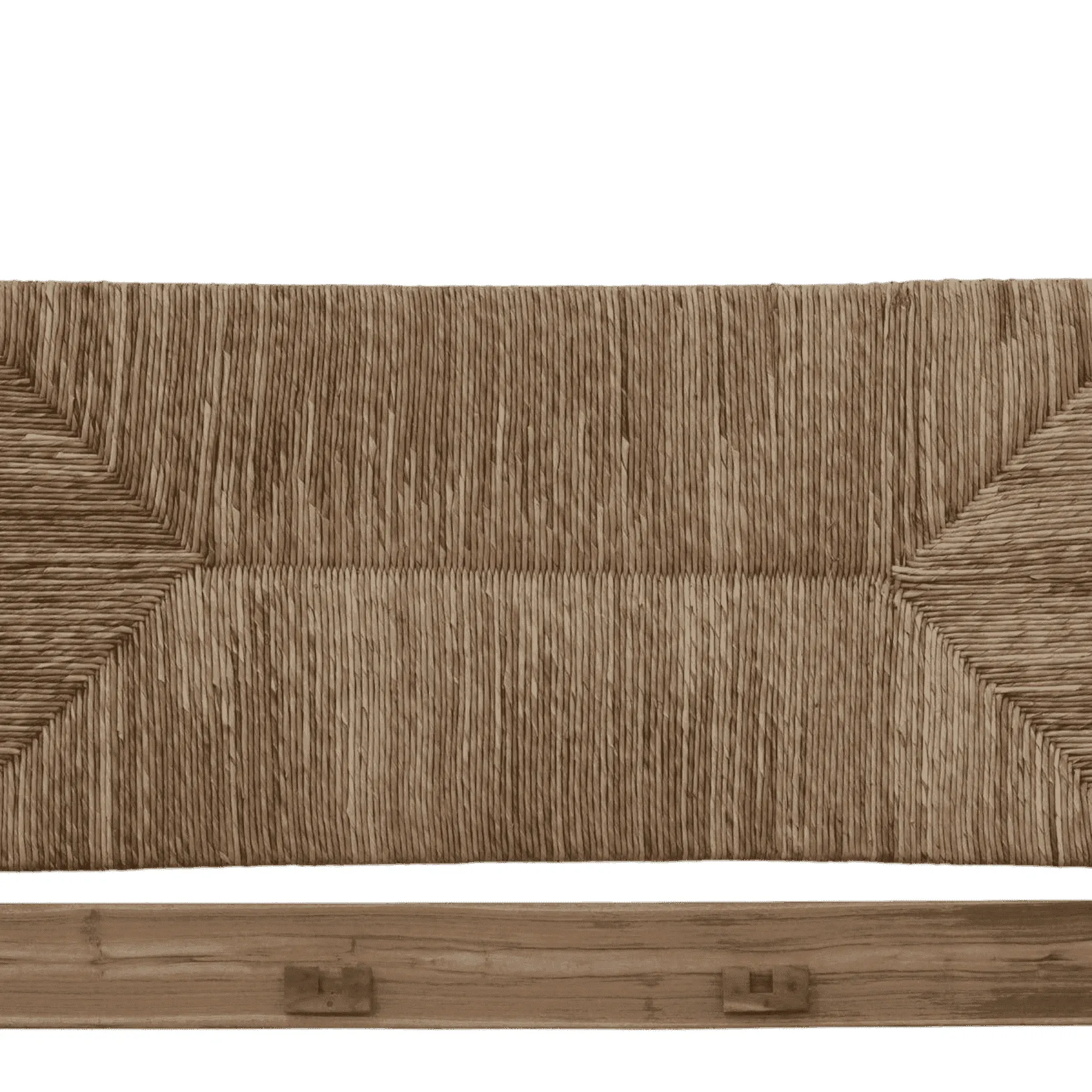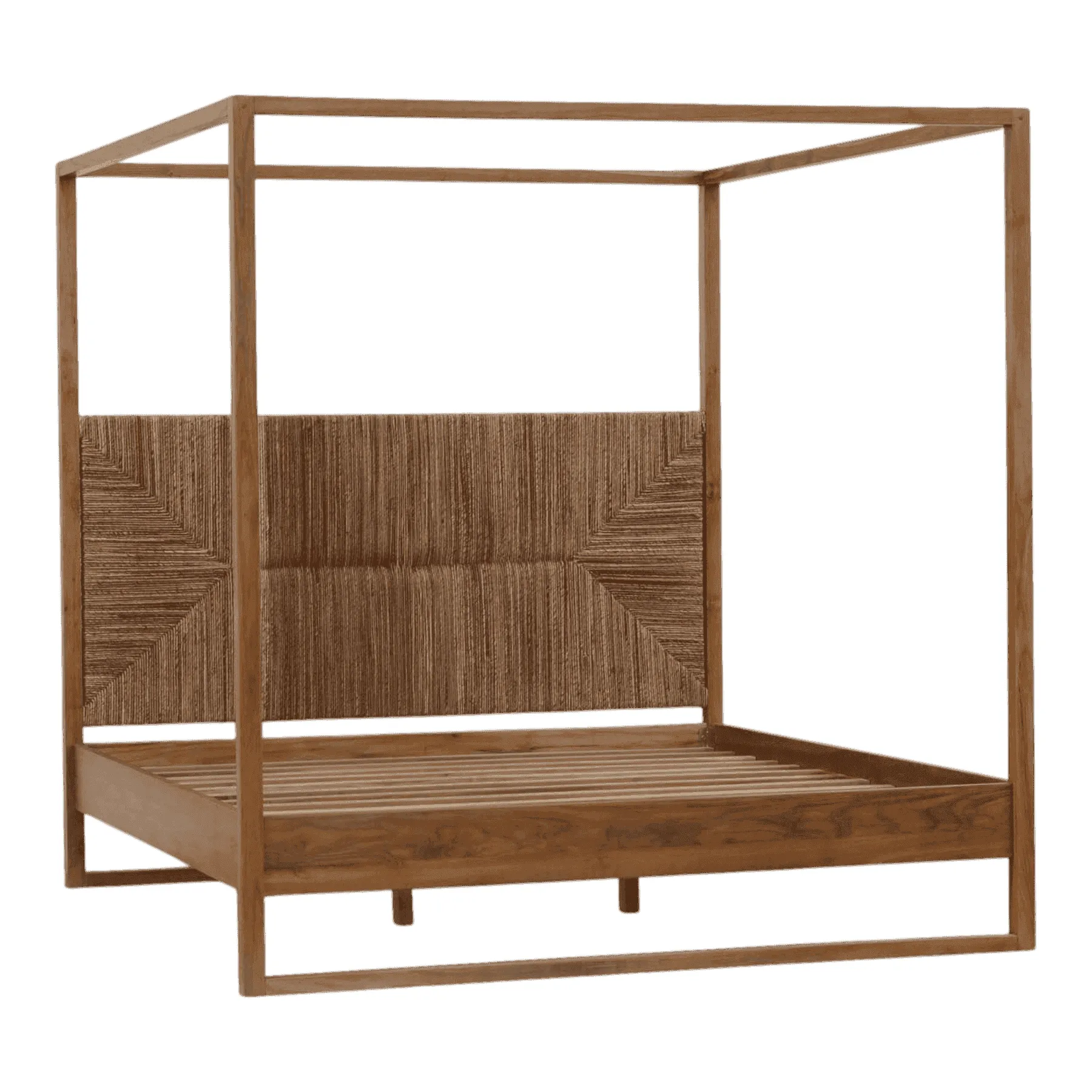 Primary Frame: Solid Teak Wood | Joinery: Mortise and Tenon, Bolted Canopy | Finish: Natural Teak Oil | Upholster & Cushion: Woven Seagrass or Abaca Headboard Panel