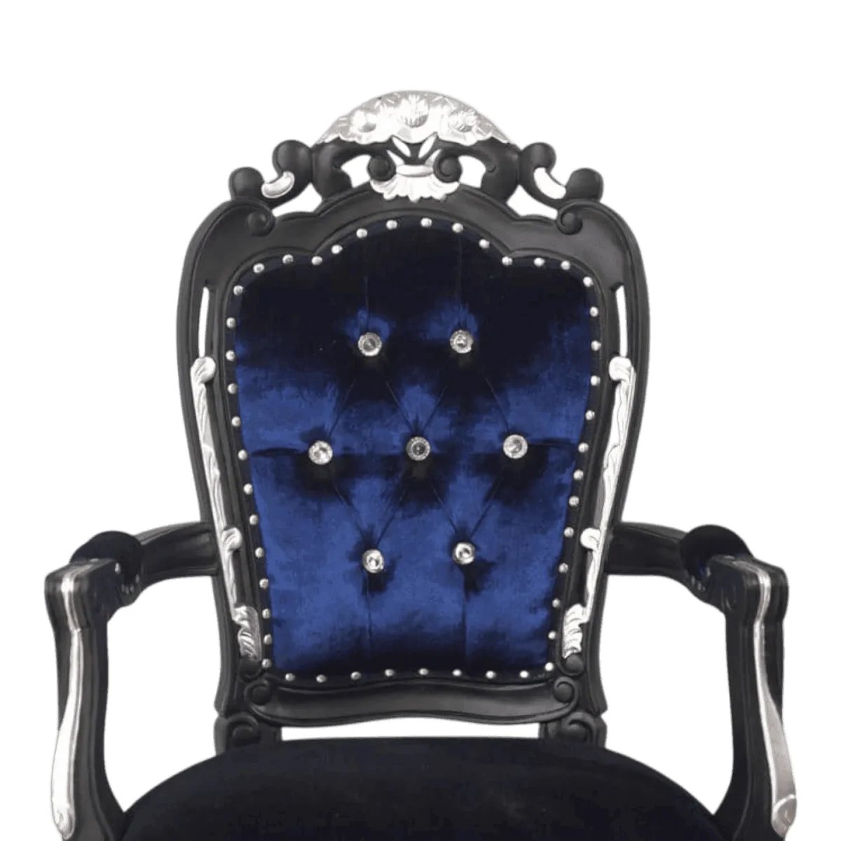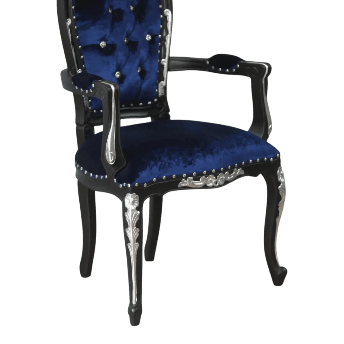 Embrace the drama of the Rococo era with this stunning statement chair that marries gothic elegance with regal comfort The deep midnight blue velvet upholstery features classic button tufting providing a plush tactile experience against the imposing black frame Artisans have highlighted the intricate floral carvings on the crest and apron with metallic silver leaf creating a striking visual contrast that catches the light Ideal for high-end lounge areas or as a singular accent piece in a master suite this armchair offers unwavering support through its solid wood construction and timeless cabriole legs