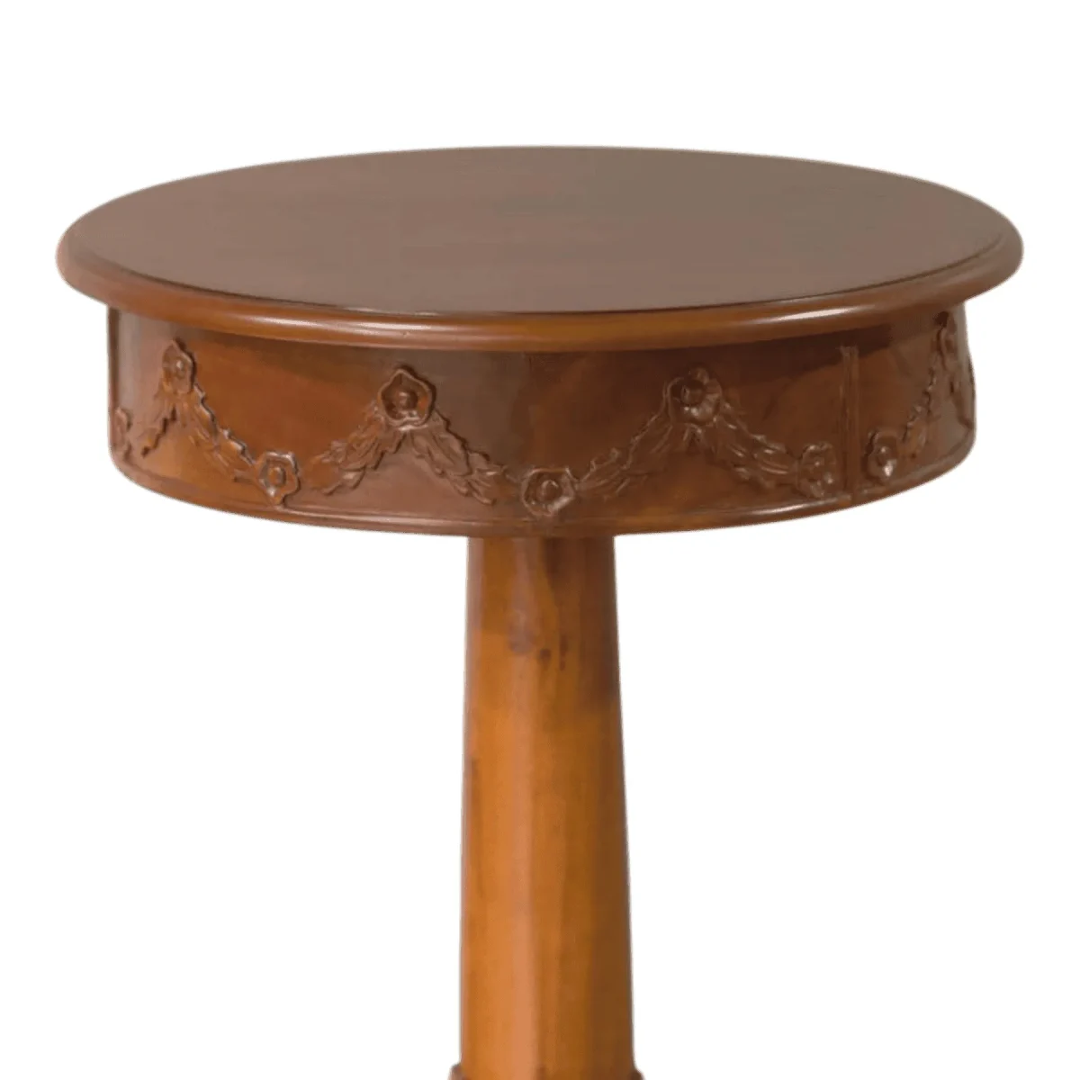Capture the essence of classical craftsmanship with this exquisite round pedestal table featuring deep relief floral carvings around the perimeter The rich warm wood tones are brought to life through a multi-step polishing process that reveals the natural beauty of the grain Supported by a stout central pillar and a unique tri-point base with bun feet this table offers both exceptional stability and artistic flair Ideal for use as a grand entryway focal point or an intimate breakfast nook addition it brings a sense of history and permanence to the home