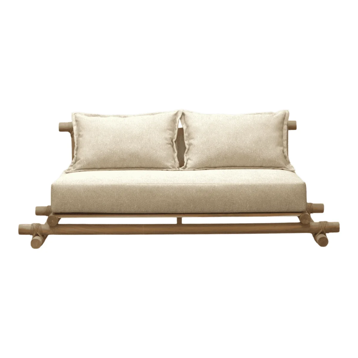 Invite the tranquility of nature into your garden with this sofa designed for ultimate relaxation The frame is constructed from sturdy solid Teak wood together with synthetic fiber rope creating a rustic yet durable foundation Topped with plush overstuffed beige cushions on the seat and back it offers a cloud-like sitting experience that encourages lounging This piece is perfect for a sunroom covered patio or a boho-chic living space seeking an earthy touch
